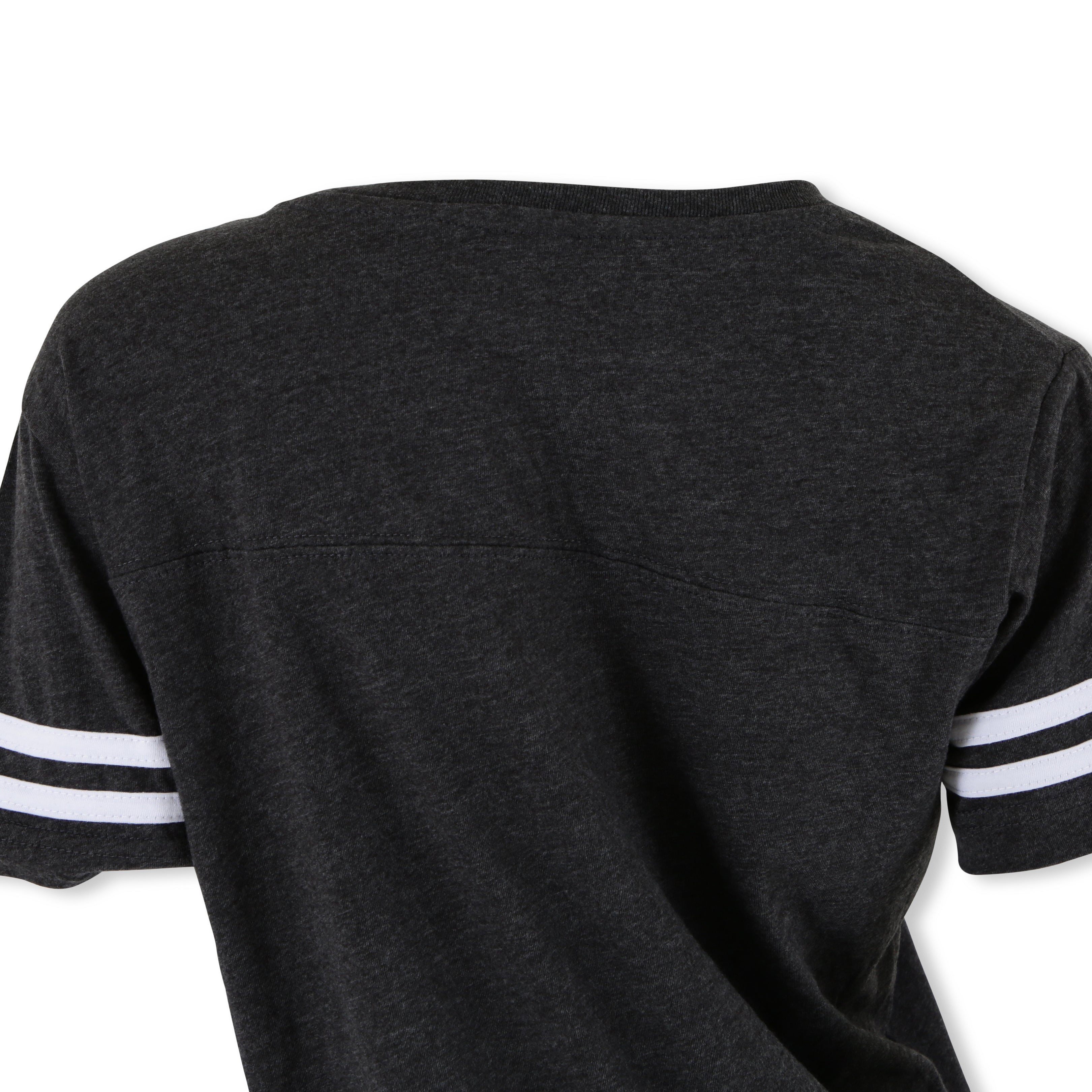 SIMPSON LADIES RACING STRIPES T SHIRT LG Ladies RACING STRIPES T - LG Ladies Large T-Shirt Fun v-neck T-Shirt with striped sleeves for style and 60/40 combed ring-spun cotton/poly blend for comfort. 60/40 combed ring-spun cotton/polyester Front yoke, Two contrast stripes on sleeves, Ribbed collar Shoulder to shoulder self fabric back neck tape, Side seam construction Double needle sleeves and bottom hem Tear-away neck label Printed graphics