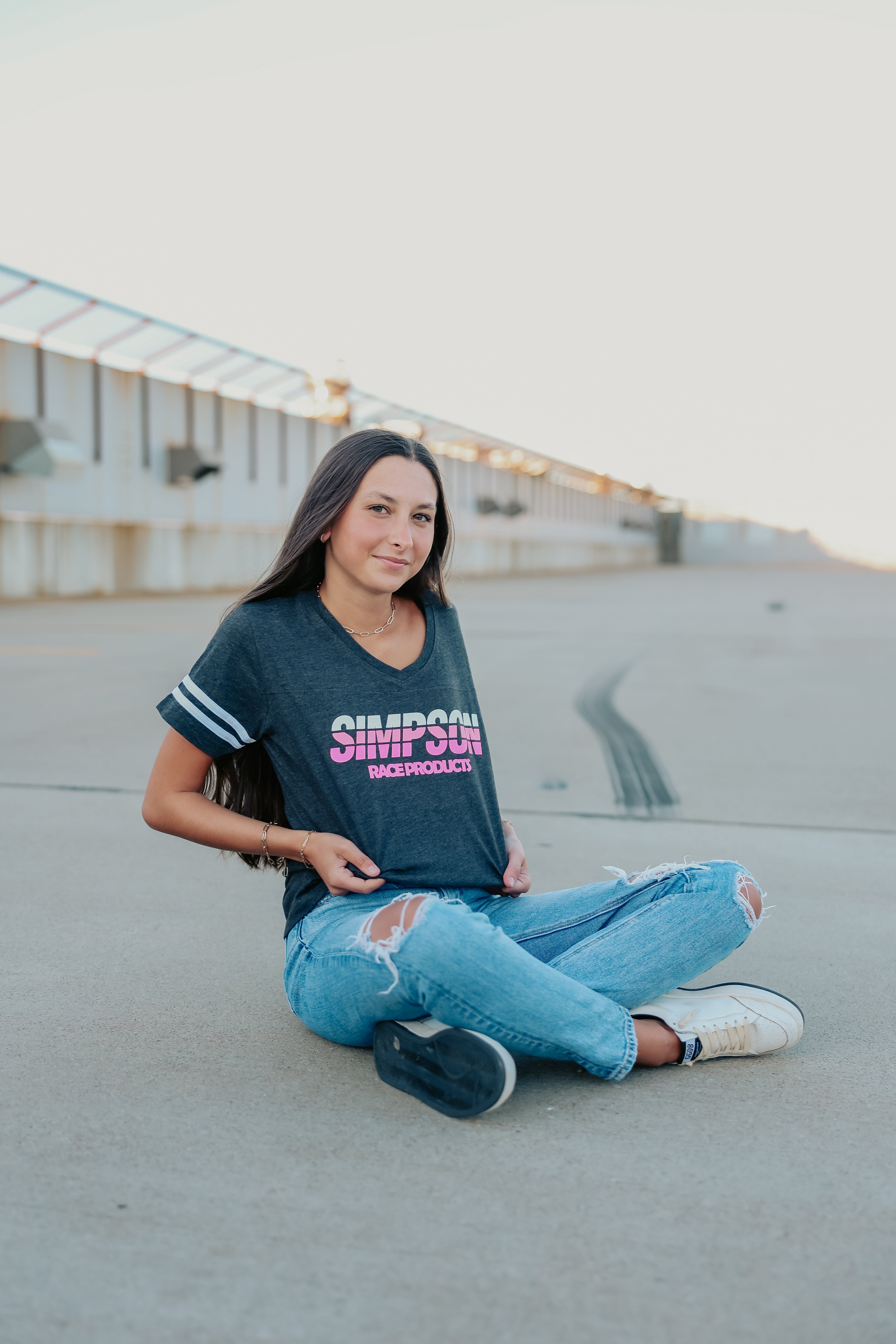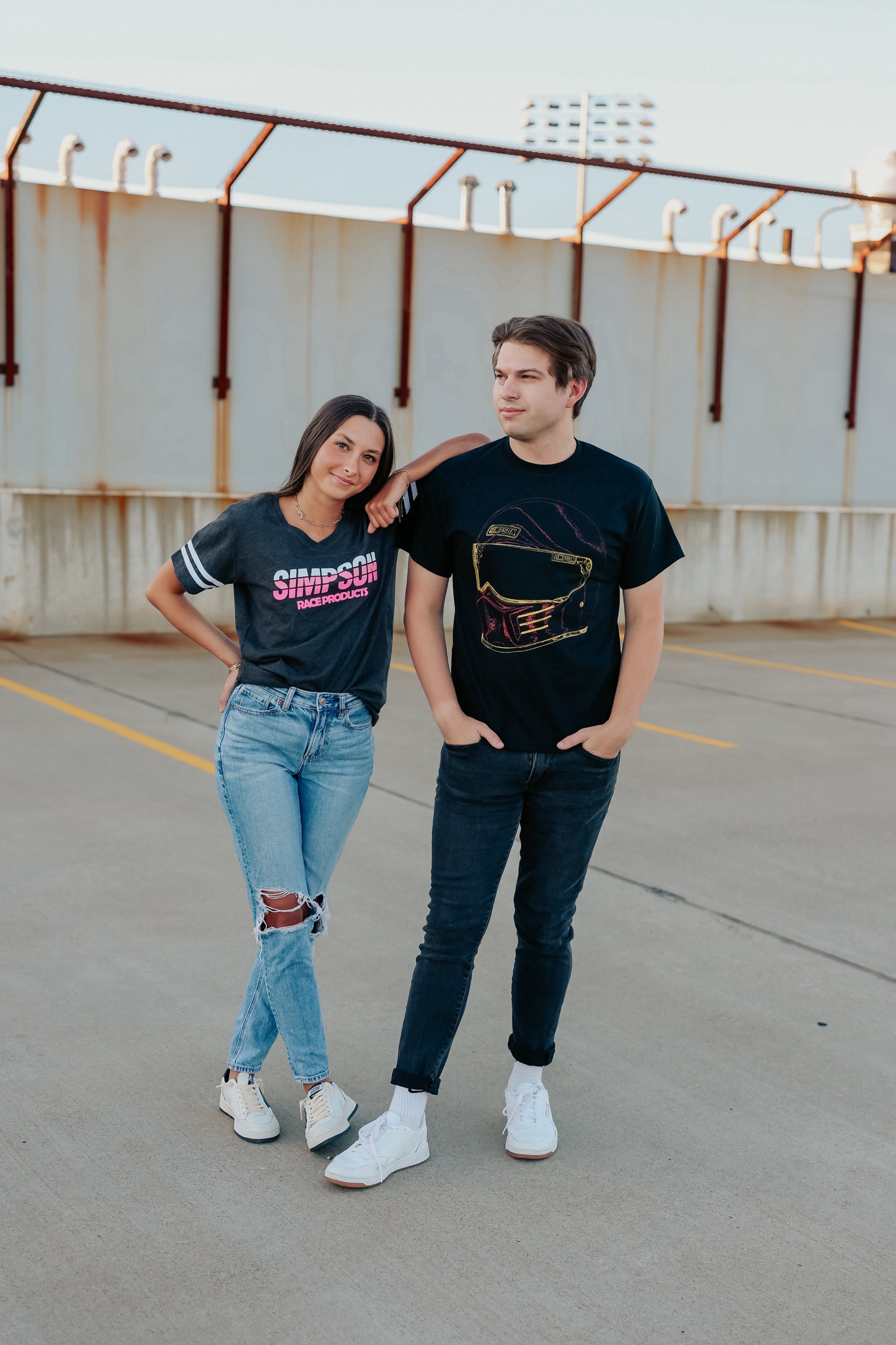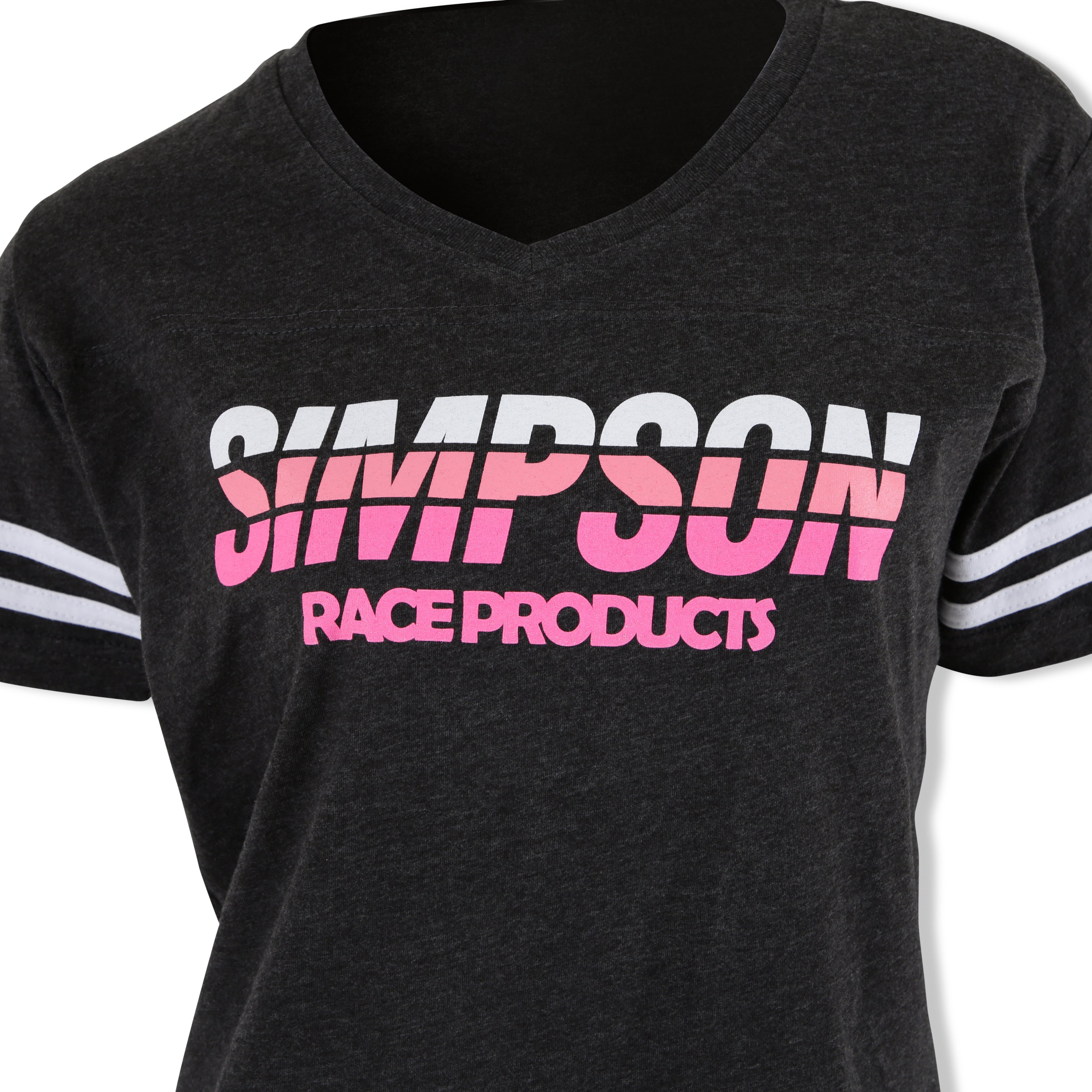 SIMPSON LADIES RACING STRIPES T SHIRT SM Ladies RACING STRIPES T - SM Ladies Small T-Shirt Fun v-neck T-Shirt with striped sleeves for style and 60/40 combed ring-spun cotton/poly blend for comfort. 60/40 combed ring-spun cotton/polyester Front yoke, Two contrast stripes on sleeves, Ribbed collar Shoulder to shoulder self fabric back neck tape, Side seam construction Double needle sleeves and bottom hem Tear-away neck label Printed graphics