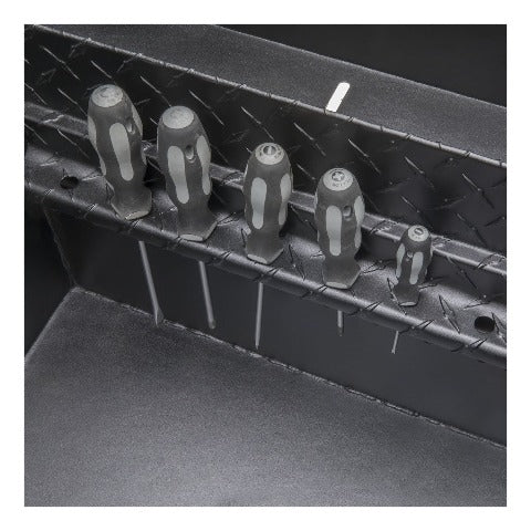 UWS crossover truck tool boxes are the tried-and-true way of keeping your tools organized, on-hand and fully secure no matter where you and your truck roam. Each UWS tool box is built from extra-thick aluminum welded into a single-piece tub. This provides the tool box with reliable strength and helps keep the interior sealed off from the elements. Aluminum construction also makes the box highly resistant to corrosion for long-lasting use. To add even more strength to the crossover truck tool box, the lid features our patented RigidCore foam-filled design. Layered between two sheets of aluminum, this core greatly increases the structural integrity of the lid to prevent bending and warping and to ensure smooth opening and closing. The lid is able to open to a full 90 degrees, providing better access to tools, equipment and other stored items. It also features self-opening struts to make it easy to open the box when your hands are full. This particular truck tool box features a low profile, meaning the lid is built lower than our standard lid. This provides a better view out the rear cab window and additional clearance for other items in the truck bed, if needed. To keep out moisture, dirt and even insects, the lid is also fitted with a MicroSeal gasket that seals off the inside of the tool box from the outside elements. UWS crossover truck tool boxes make it easy to keep your tools and other items organized, featuring built-in screwdriver holders and a three-compartment sliding tool tray. The tool box itself is easy to install and is available in multiple sizes to provide the perfect for your truck and lifestyle. Like all UWS products, each crossover truck tool box is proudly assembled right here in the USA for style and long-lasting dependability (NOTE: This product is heavily packaged for parcel shipping).