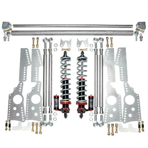 QA1 HD Pro Rear Drag 4-Link System includes brackets, trailing arms, diagonal link kit, hardware, tube adapters, QA1 rod ends, QA1 coilovers, and shock crossmember to build a performance drag race style 4-link suspension.