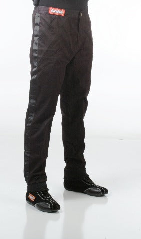 The RaceQuip 112 series single-layer SFI-1 racecar driver's fire suit pants are made from Pyrovatex® FRC material. Note that sometimes this material is referred to as fireproof, but actually all auto racing safety gear is fire retardant. Pyrovatex® offers the maximum combination of overall flame and heat protection, durability and comfort for the price. This fire retardant cotton based (FRC) material is used because it retains the softness and breathability of cotton and will wick away moisture from the skin. Pyrovatex® fabric is gentle and non-irritating to even the most sensitive skin. The treatment process leaves the exterior surface shiny and supple. Since the Pyrovatex® process combines a chemical agent with the raw cotton fibers to create a bond at the molecular level, with proper care, the pants will retain their flame retardant properties beyond the useful life of the garment. All race driver pants are assembled with heavy-duty, multi-needle, over-lock safety stitch machines to provide exceptional seam strength. All RaceQuip pants feature a high quality heavy duty Nomex® backed brass zipper installed with a double overlap for a more secure front opening. Stylish contrasting full-length black leg stripes match the armband stripes found on RaceQuip driving jackets. The black Nomex(R) cuffs and boot cut bottom give the racing pants a unique look and style and yet provides an outstanding value. Exceeds SFI 3.2A/1 specs with a TPP rating of 11. Available only in Black with black full-length leg stripes and manufactured in sizes from Small ?? 5X-Large (refer to sizing chart).