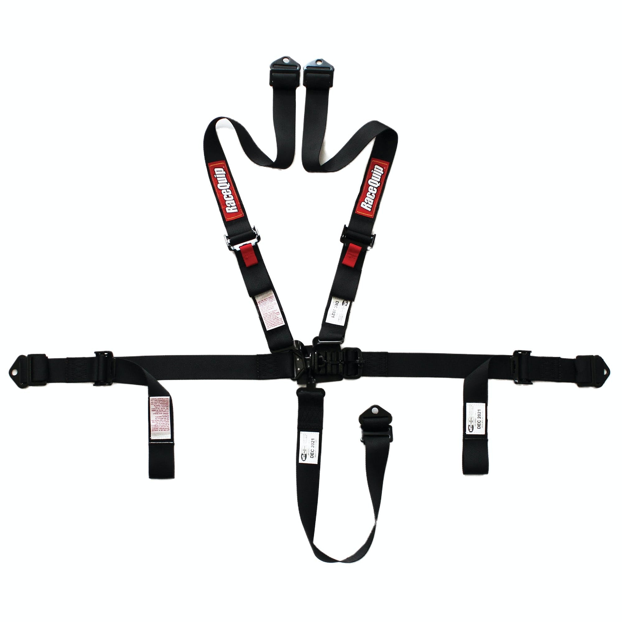 RaceQuip’s all 2 small buckle Latch & Link Pro 5-point auto racing harness set has twin individual HANS / HNR style shoulder belts and is manufactured using premium polyester webbing and drop forged steel black hardware to exceed the SFI 16.1 rating. Shoulders are 2 width to accommodate a HANS or other Head & Neck Restraint Device and adjust from 26 to 62 in length. The 2 wide lap belt adjusts from 30 to 65. Many racers now prefer a 2 lap belt because it tucks under the iliac crest (hip bone) so that you can get the lap belt tighter. This harness set is a pull up lap design, which means that the lap belt straps must be pulled up and toward the center latch & link buckle mechanism to tighten the belts . This 2 Pro Harness set features a small compact design buckle that is lightweight and stays out of the way. Both shoulder belts and the sub-belt are hooked over the link; the link is inserted into the latch on the lap belt; the lever is then brought down into and over the link, securely holding all of the pieces in place. Since RaceQuip seat belt sets are double adjustable, lengths are simply adjusted on either end for ease of installation. Using the included three bar slide you can mount the belts by either wrapping them around a rollbar or by bolting them in place wi(more...)