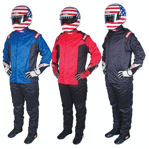 The RaceQuip 9161 series Chevron-5 multi-layer SFI-5 racecar driver's fire suit jacket is made up of an outer layer of durable Nomex® and a soft, comfortable and lightweight Nomex® liner with Chevron pattern box quilting. The stylish modern Euro design is accentuated with black trim Euro epaulets, black side panels, and black Nomex cuffs. The side panels feature knit stretch fabric for flexibility in the torso and the 180° floating arm gussets increase flexibility in the arms. The Chevron-5 jackets feature a high quality, heavy duty Nomex® backed brass, two-way zipper installed with a double overlap for a more secure front opening. Exceeds SFI 3.2A/5 specs. Available in Black, Red or Blue with Black accents. Manufactured in sizes Small - 3X-Large (refer to sizing chart). Note that sometimes these materials are referred to as fireproof, but actually all auto racing safety gear is fire retardant.