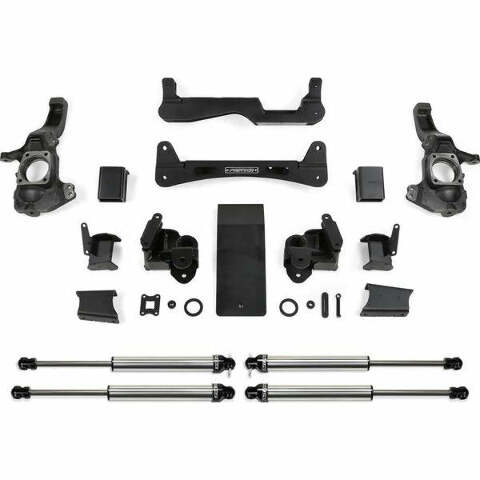 This new 4 System capitalizes on Toyota Tundras large wheelwell opening to allow use of 35 tall tires with minimum lift height. The design of this 4 System is a new style of suspension that delivers improved performance with fewer parts, and comes with an affordable price. The system includes replacement upper control with a .120 wall DOM arm with heavy duty extended range ball joints that provide additional strength to the front suspension. Heavy duty extended length steering knuckles are included to provide proper functionality of the factory ESC (Electronic Stability Control) with 35 tall tires. The knuckles retain the stock track width keeping the tires under the front fenders. The front differential is relocated to keep CV angles proper during the full range of travel. Front bump stop extensions and brake hose relocation brackets complete the front suspension. Rear lift comes from a 1 lift block and u-bolt system to level the stance of the vehicle. The 4 System is available with a spacer system to retain the factory Coilover shocks and rear Performance shocks.