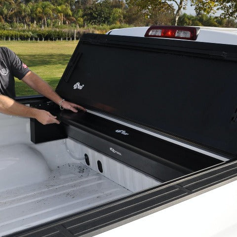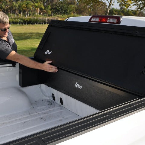 The BAKBox2 is a toolbox for the back of your truck that is designed to integrate with a BAK truck bed cover. Unlike a regular toolbox, the BAKBox2 has a wealth of design innovation built into it that sets it apart from any other toolbox The BAKBox2 can conveniently fold away when not in use, giving you full bed access when need to haul large loads. It's made from solid FRP composite panels, making more impact resistant than an aluminum toolbox. Like all BAKFlip truck bed covers, the BAKBox2 lays completely flush, and doesn't stick out above the rails of your truck, providing a clean, stylish look. BAKBox2 is made in the USA. installs quickly, and is guaranteed to last as long as your truck does.