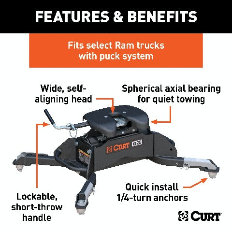 The CURT Q25 5th wheel hitch offers superior towing power and a quiet ride to be the ultimate in RV towing. The spherical axial bearing of the Q25 is what makes this hitch unique. It offers free, unimpeded movement of the 5th wheel head, allowing it to tilt in any direction. Once coupled to the kingpin, the head pivots and angles with your 5th wheel trailer, providing a smooth, quiet ride. It also uses a pair of dual-locking jaws to completely wrap the kingpin and ensure a secure vehicle-trailer connection. To make the Q25 even quieter, it comes with three grease fittings and a polyethylene lube plate for optimum lubrication. Constructed from strong carbon steel and rigorously tested for safety in accordance with SAE J2638, the Q25 5th wheel hitch is the ideal extension for your full-size pickup truck. To ensure good functionality and a long life under the most strenuous towing conditions, this 25K 5th wheel hitch is coated in a carbide black powder coat finish, giving it highly durable protection against rust and wear. This particular Q25 hitch comes with a set of CURT OEM puck system 5th wheel legs, designed to be mounted on a Ram long-bed pickup with the truck bed puck system. Using a set of quarter-turn anchors, the legs quickly and easily drop into the pucks, instantly mounting the Q25 hitch and equipping the truck for 5th wheel towing. The anchors feature an adjustable design to perfectly lock the hitch into place and eliminate any chucking noises, and the legs are finished in a durable carbide black powder coat to be highly resistant to scratches, rust and UV damage. These legs are only intended to fit the Ram puck system and cannot be installed without it. Certain turret-style pin boxes, such as Sidewinder, are not compatible with CURT Q-series hitches and should not be used as they may create vehicle / trailer handling hazards.
