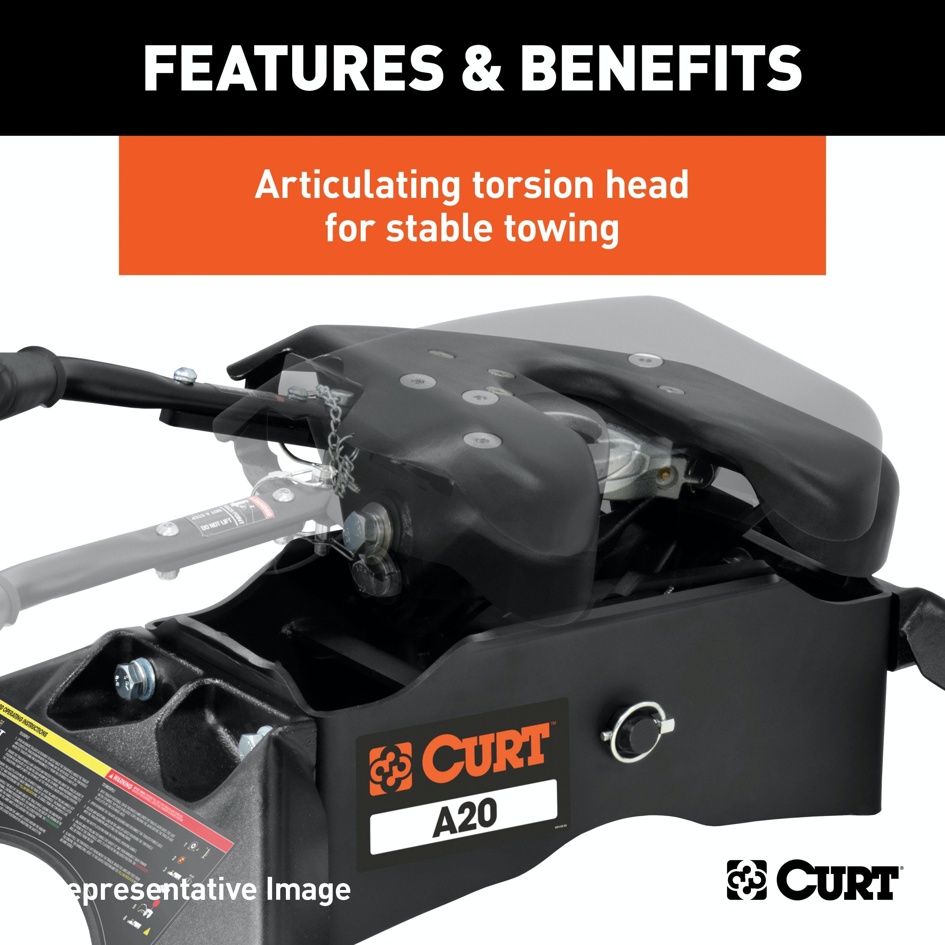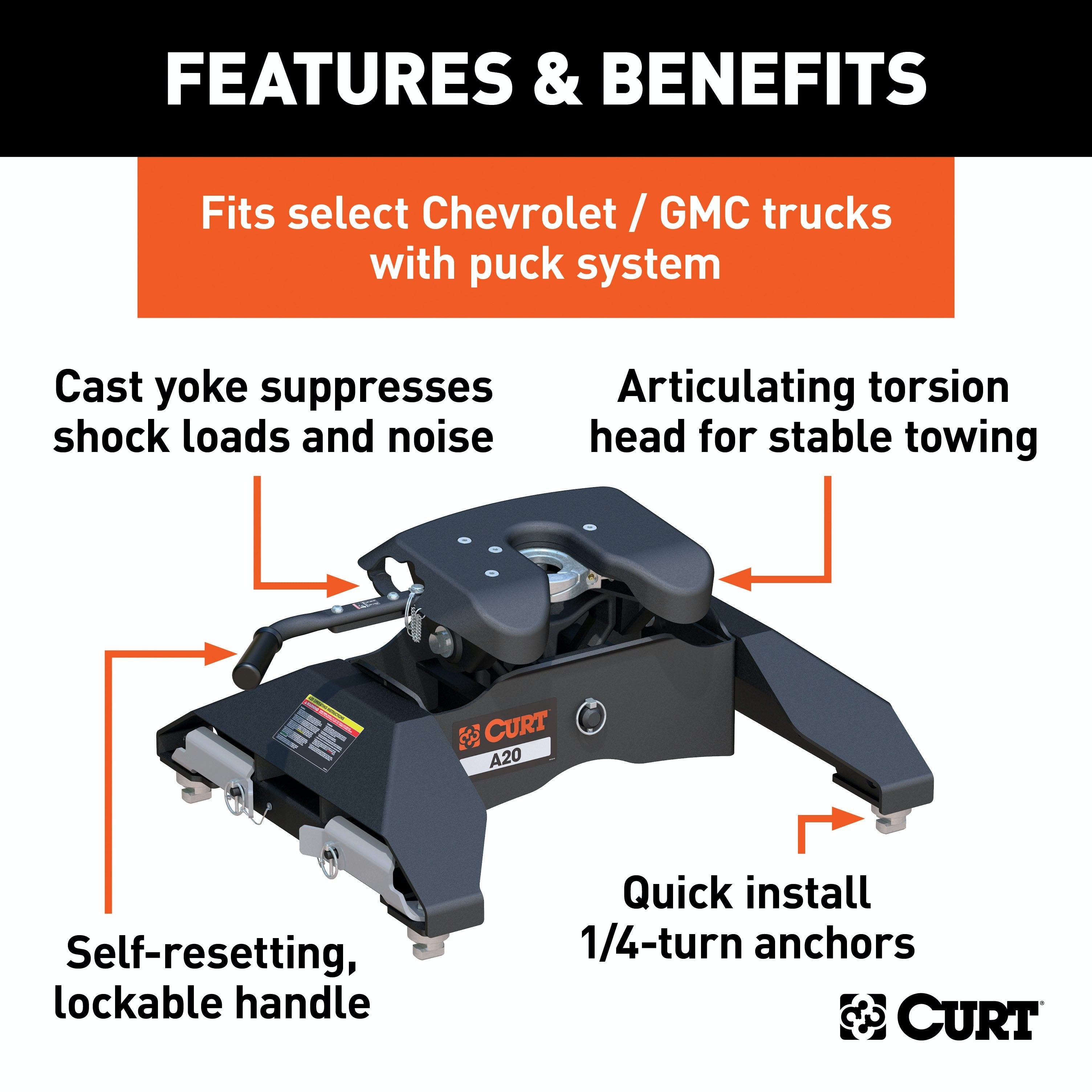 The CURT A20 5th wheel hitch offers smoother, quieter towing for your home-away-from-home, combining the patented technology of our A-series, an easier mounting system and the power of a 20K 5th wheel hitch. Like our A16 hitch, this 20K 5th wheel hitch uses a patented cast yoke to allow for unimpeded head movement, while providing exceptional stability for the trailer. The yoke has a set of poly-torsion inserts to suppress shock loads and reduce excessive noise, and the head features high-strength, interlocking jaws to give the trailer stability and the freedom to pivot and swivel as needed. This A20 5th wheel hitch also comes with a set of CURT OEM puck system 5th wheel legs designed to be mounted on select Chevrolet or GMC long-bed pickup trucks with the truck bed puck system (year range specific). The legs mount directly into the four-point mounting system, allowing the CURT A20 hitch to be installed quickly and easily. The most unique feature of these legs is their quarter-turn anchoring system. The variable-position anchors allow the 5th wheel hitch head to easily drop into the puck system, and with a quarter-turn, the hitch can be installed or removed as needed. The anchors can also be adjusted to eliminate any chucking noises. Once installed, the A20 is fast and simple to operate. It has a lockable, single-throw handle that self-resets to the ready-to-couple position after uncoupling, and it is equipped with a coupling indicator that is visible from the truck cab. To protect the A20 5th wheel hitch against rust and wear, it comes with a black carbide powder coat finish and a limited lifetime warranty. We also test the A20 for safety in accordance with SAE J2638 to ensure reliability for the road ahead.