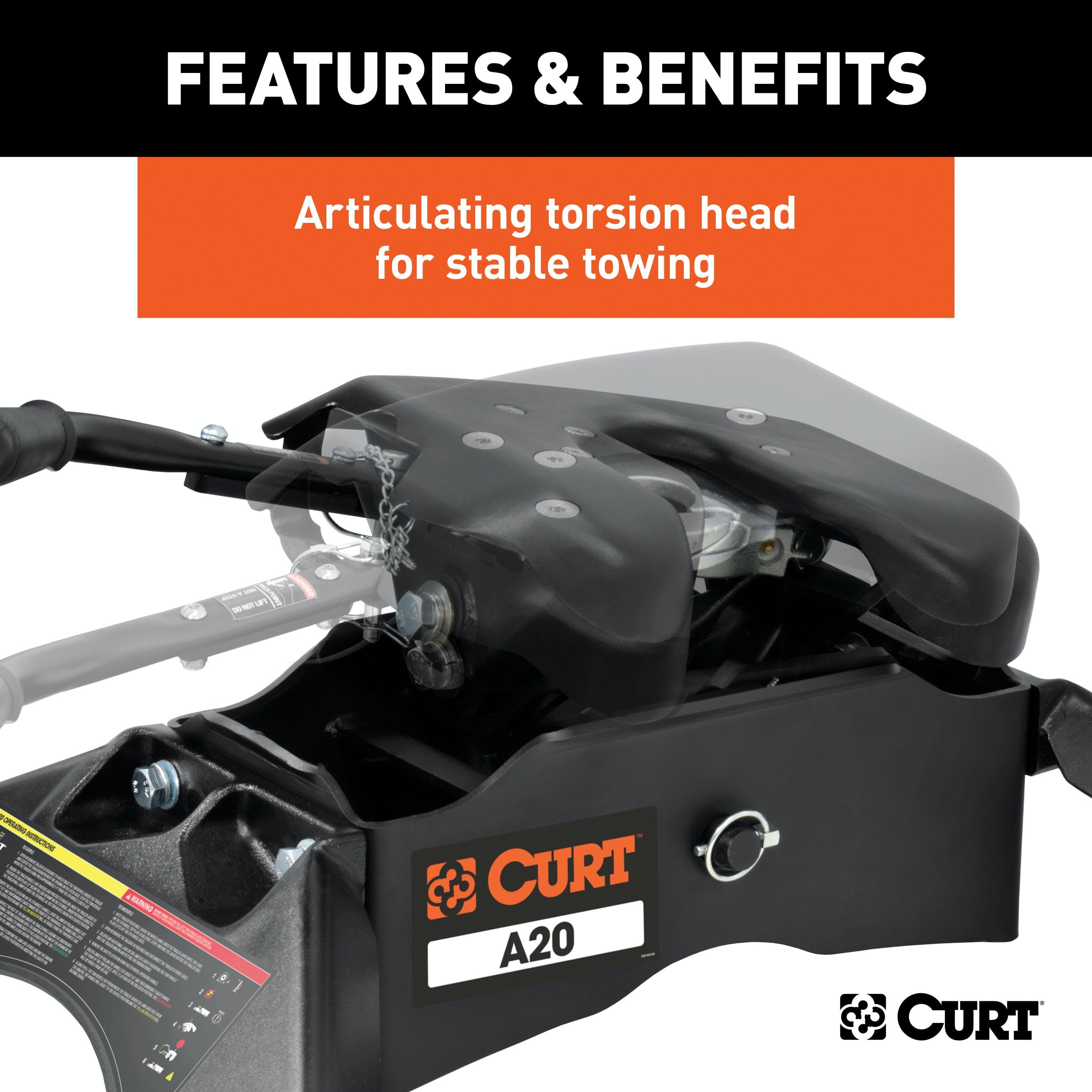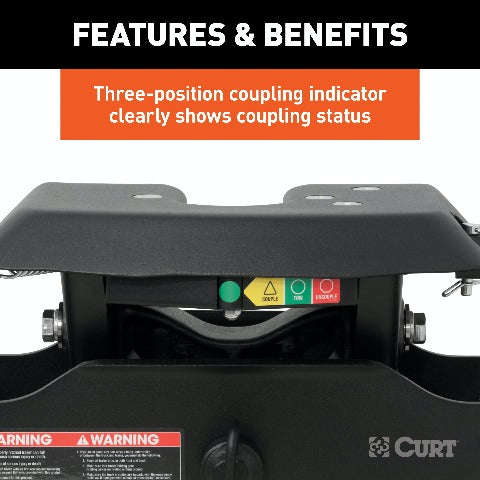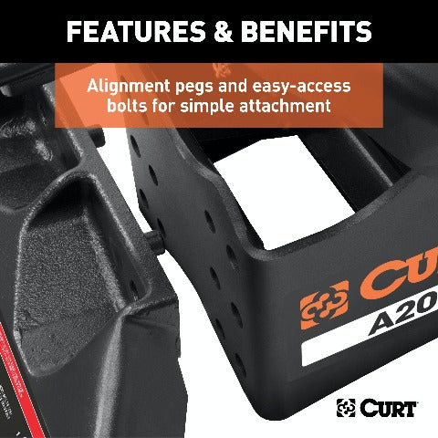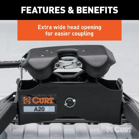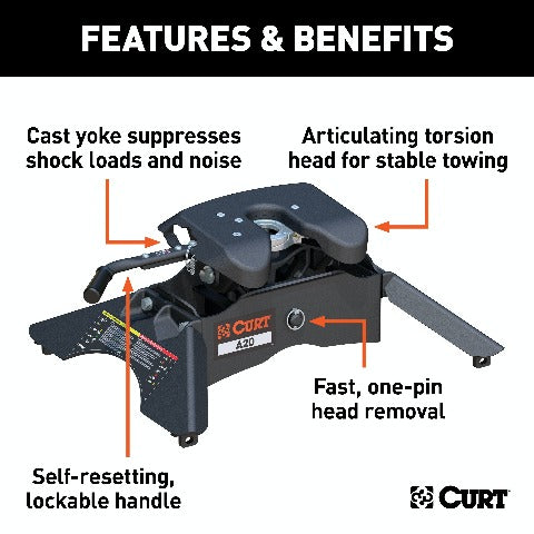 The CURT A20 5th wheel hitch offers smoother, quieter towing for your home-away-from-home, combining the patented technology of our A-series, an easier mounting system and the power of a 20K 5th wheel hitch. Like our A16 hitch, this 20K 5th wheel hitch uses a patented cast yoke to allow for unimpeded head movement, while providing exceptional stability for the trailer. The yoke has a set of poly-torsion inserts to suppress shock loads and reduce excessive noise, and the head features high-strength, interlocking jaws to give the trailer stability and the freedom to pivot and swivel as needed. The A20 5th wheel hitch is also engineered for easier installation. The legs are equipped with two pins to properly align with the mounting holes, and they have easy-access mounting bolts for ergonomic tightening. The 5th wheel head also has a fast, one-pin removal system to make installation and removal from the truck bed easier. This 20K 5th wheel mounts to any industry-standard 5th wheel rails, using the 5th wheel legs or a CURT 5th wheel roller. It can also be mounted into the puck system of a truck equipped with the towing prep package, using our OEM-compatible legs or roller adapters. Once installed, the A20 is fast and simple to operate. It features an extra-wide head opening to increase the coupling area for the trailer, and it has a lockable, single-throw handle that self-resets to the ready-to-couple position after uncoupling. To make coupling even easier, it is equipped with a coupling indicator that is visible from the truck cab. The indicator shows the status of the connection and eliminates the need for you to check multiple times while coupling. To protect the A20 5th wheel hitch against rust, wear and whatever other threats might impede your cross-country tour, it comes with a black carbide powder coat finish and a limited lifetime warranty. We also test the A20 for safety in accordance with SAE J2638 to ensure reliability for the road ahead.