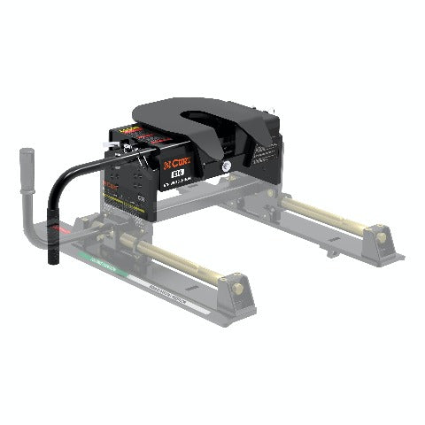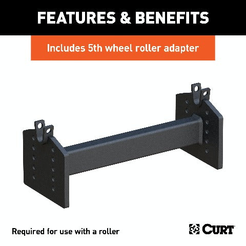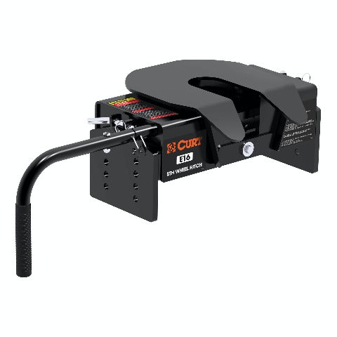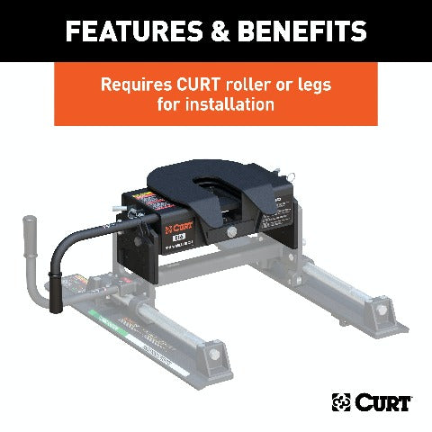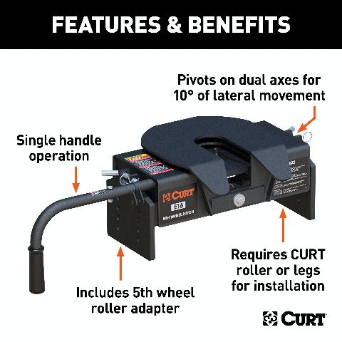 The CURT E16 5th wheel trailer hitch is an economical choice that offers many of the same features found in our Q-Series 5th wheel hitches. The E16 has a gross trailer weight rating of 16,000 lbs. and can withstand a vertical load up to 4,000 lbs. It comes with a dual-pivoting head, 10 degrees of lateral movement and an anti-rattle skid plate to provide a smoother, quieter ride. The E16 also comes with easy, single-handle operation and a durable carbide powder coat for long-lasting protection against the elements. With four height adjustment settings, the E16 is quick and simple to install, and it is backed by a limited lifetime warranty. This 16K 5th wheel hitch head comes ready to be attached to the CURT R16 5th wheel roller.