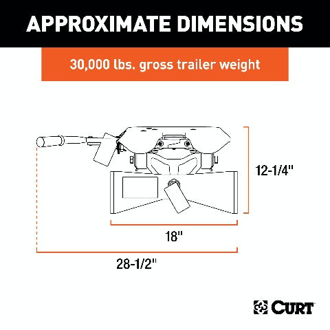 The CURT A30 5th wheel hitch offers smoother, quieter towing for your home-away-from-home, combining the patented technology of our A-series, an easier mounting system and the power of a 30K 5th wheel hitch. Like our other A-series hitches, this 30K 5th wheel hitch uses a patented cast yoke to allow for unimpeded head movement, while providing exceptional stability for the trailer. The yoke has a set of poly-torsion inserts to suppress shock loads and reduce excessive noise, and the head features high-strength, interlocking jaws to give the trailer stability and the freedom to pivot and swivel as needed. The A30 5th wheel hitch is also engineered for easier installation. The 5th wheel head has a fast, one-pin removal system to make installation and removal from the truck bed easier. This 30K 5th wheel can be mounted using 5th wheel legs or a CURT 5th wheel roller (sold separately). It can also be mounted into the puck system of a truck equipped with the towing prep package, using our OEM puck system legs or roller adapters. Once installed, the A30 is fast and simple to operate. It features an extra-wide head opening to increase the coupling area for the trailer, and it has a lockable, single-throw handle that self-resets to the ready-to-couple position after uncoupling. To make coupling even easier, it is equipped with a coupling indicator that is visible from the truck cab. The indicator shows the status of the connection and eliminates the need for you to check multiple times while coupling. To protect the A30 5th wheel hitch against rust, wear and whatever other threats might impede your cross-country tour, it comes with a black carbide powder coat finish and a limited lifetime warranty. We also test the A30 for safety in accordance with SAE J2638 to ensure reliability for the road ahead.