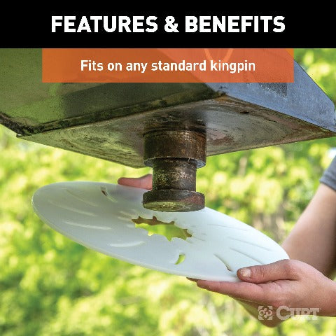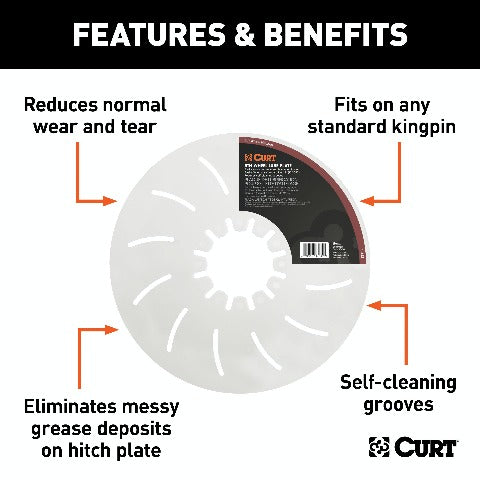 The grand lifestyle that goes hand in hand with 5th wheel towing is made perfect in the details. You can talk all you want about whose RV hogs the most road or whose 5th wheel hitch can handle the most tonnage, but when you get down to it, the best hitch and trailer setup in the world can never reach its full potential without the right accessories to back it up. Protect your 5th wheel hitch and 5th wheel trailer with a CURT lube plate. This 12 disc easily slides onto the kingpin of your 5th wheel trailer, eliminating messy grease deposits and reducing normal wear and tear when towing with your 5th wheel.