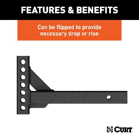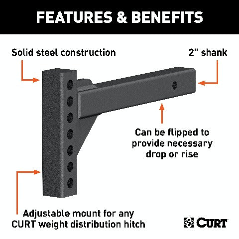 When it comes to enjoying your passion, we think towing equipment should never be the limiting factor. This CURT weight distribution replacement shank is designed for heavy-duty towing, versatile adjustment of your weight distribution hitch and long-lasting reliability. Made from high-strength steel and tested for safety, this WD replacement shank is perfect for a variety of tough jobs and long journeys. It is compatible with all CURT weight distribution hitches and has a 2 shank with a 5/8 hitch pin hole to fit any 2 x 2 receiver tube opening with a 5/8 hitch pin hole, including most CURT class 3, class 4 and Xtra Duty class 5 trailer hitches. While the receiver tube shank measures 2 x 2, the vertical shank offers a universal fit to be compatible with all CURT weight distribution hitches. Holes in the vertical shank are spaced 1-1/4 center-to-center and have a 3/4 diameter, allowing for flexible adjustment of the WD head for precise leveling of the vehicle-trailer combination. This weight distribution shank can be positioned in the rise position for a maximum rise of 6 or flipped into the drop position for a maximum drop of 2. To ensure durability and long-lasting use, CURT weight distribution replacement shanks are constructed from solid steel and shielded with a highly durable carbide black powder coat finish. This protects them from rain, snow, dirt, road salt and much more for lasting corrosion resistance.