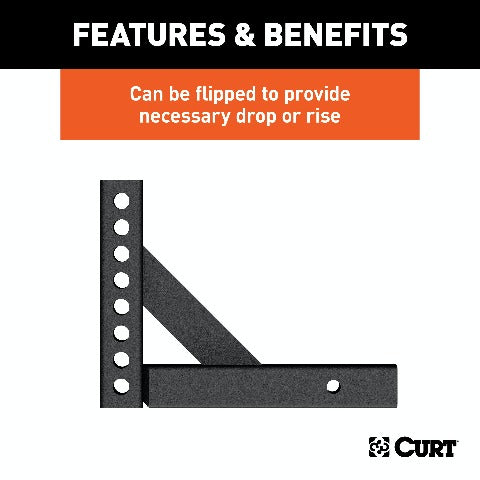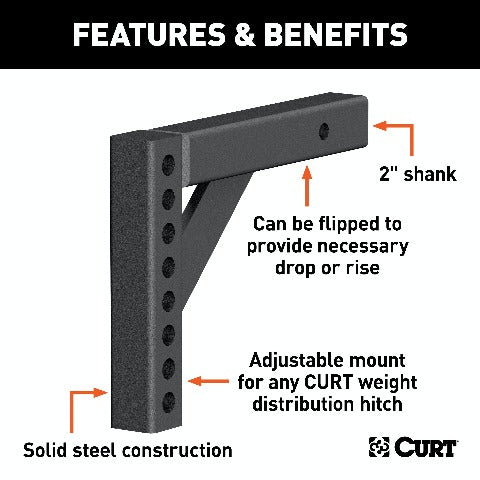 When it comes to enjoying your passion, we think towing equipment should never be the limiting factor. This CURT weight distribution replacement shank is designed for heavy-duty towing, versatile adjustment of your weight distribution hitch and long-lasting reliability. Made from high-strength steel and tested for safety, this WD replacement shank is perfect for a variety of tough jobs and long journeys. It is compatible with all CURT weight distribution hitches and has a 2 shank with a 5/8 hitch pin hole to fit any 2 x 2 receiver tube opening with a 5/8 hitch pin hole, including most CURT class 3, class 4 and Xtra Duty class 5 trailer hitches. While the receiver tube shank measures 2 x 2, the vertical shank offers a universal fit to be compatible with all CURT weight distribution hitches. Holes in the vertical shank are spaced 1-1/4 center-to-center and have a 3/4 diameter, allowing for flexible adjustment of the WD head for precise leveling of the vehicle-trailer combination. This weight distribution shank can be positioned in the rise position for a maximum rise of 8-7/8 or flipped into the drop position for a maximum drop of 5-5/8. To ensure durability and long-lasting use, CURT weight distribution replacement shanks are constructed from solid steel and shielded with a highly durable carbide black powder coat finish. This protects them from rain, snow, dirt, road salt and much more for lasting corrosion resistance.