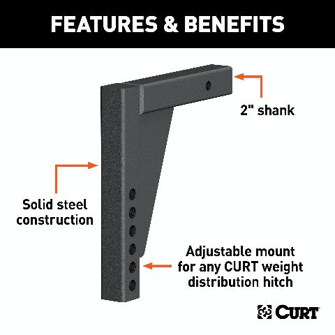 When it comes to enjoying your passion, we think towing equipment should never be the limiting factor. This CURT weight distribution replacement shank is designed for heavy-duty towing, versatile adjustment of your weight distribution hitch and long-lasting reliability. Made from high-strength steel and tested for safety, this WD replacement shank is perfect for a variety of tough jobs and long journeys. It is compatible with all CURT weight distribution hitches and has a 2 shank with a 5/8 hitch pin hole to fit any 2 x 2 receiver tube opening with a 5/8 hitch pin hole, including most CURT class 3, class 4 and Xtra Duty class 5 trailer hitches. While the receiver tube shank measures 2 x 2, the vertical shank offers a universal fit to be compatible with all CURT weight distribution hitches. Holes in the vertical shank are spaced 1-1/4 center-to-center and have a 3/4 diameter, allowing for flexible adjustment of the WD head for precise leveling of the vehicle-trailer combination. This weight distribution shank offers a maximum drop of 8-3/4 (not designed for use in the rise position). To ensure durability and long-lasting use, CURT weight distribution replacement shanks are constructed from solid steel and shielded with a highly durable carbide black powder coat finish. This protects them from rain, snow, dirt, road salt and much more for lasting corrosion resistance.