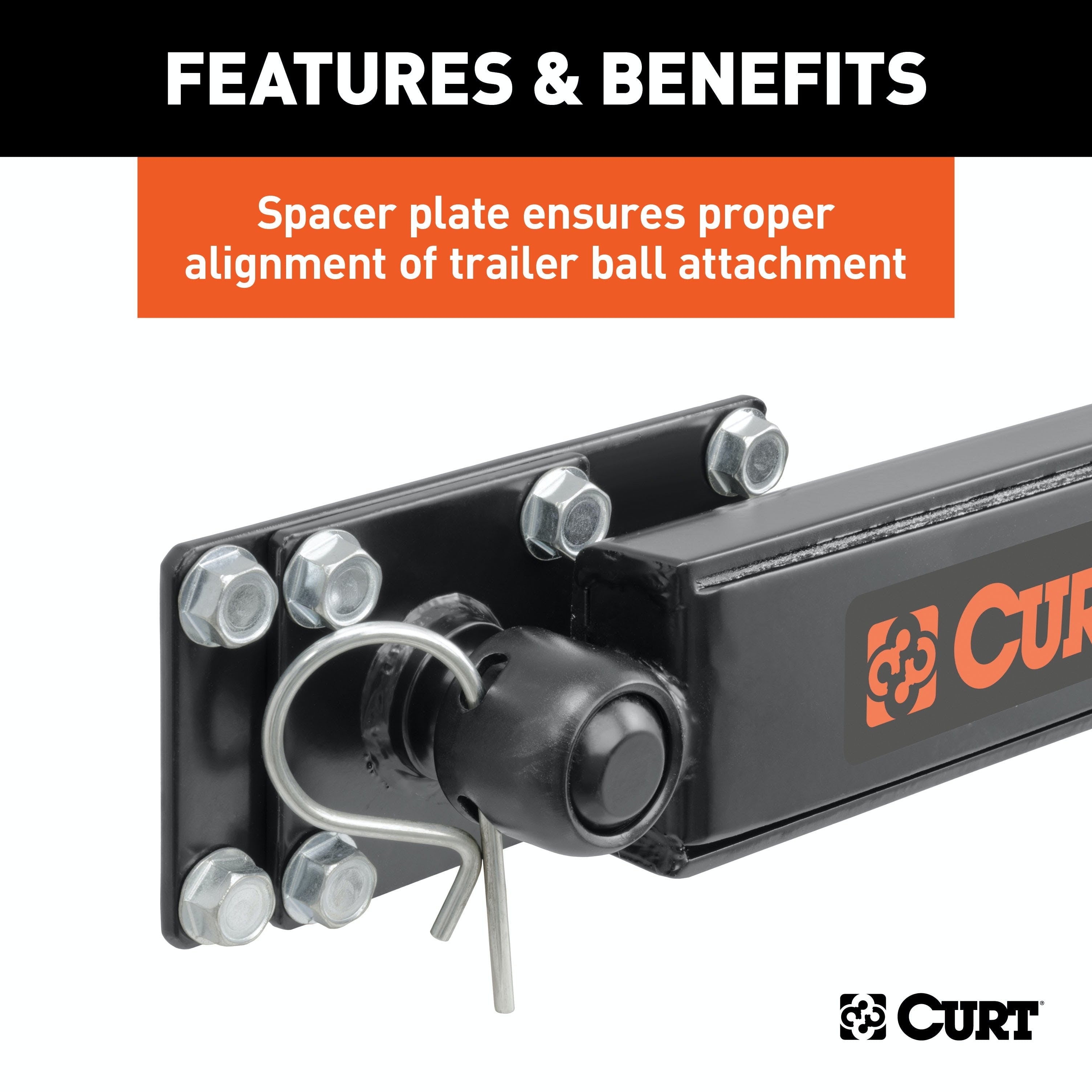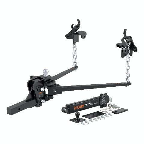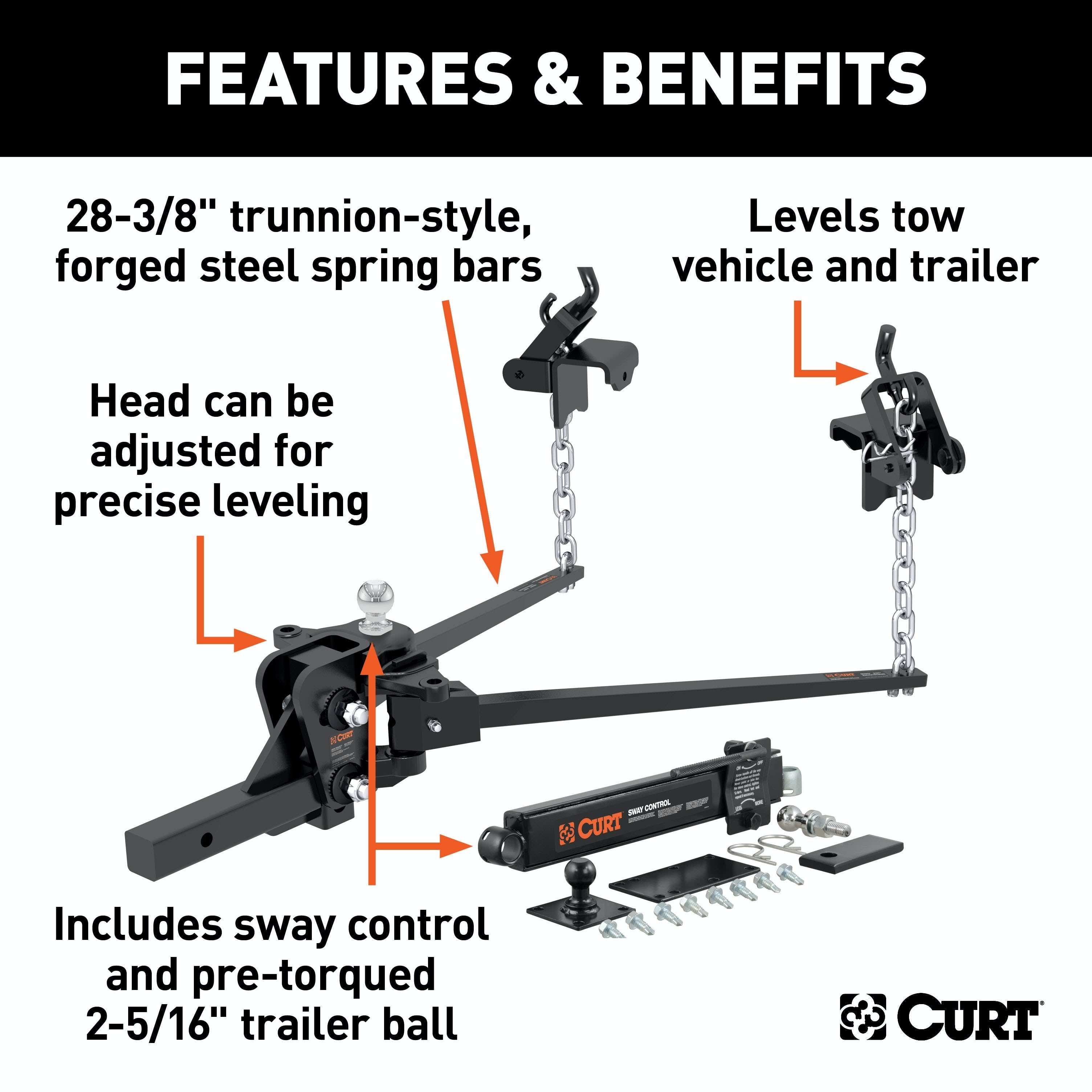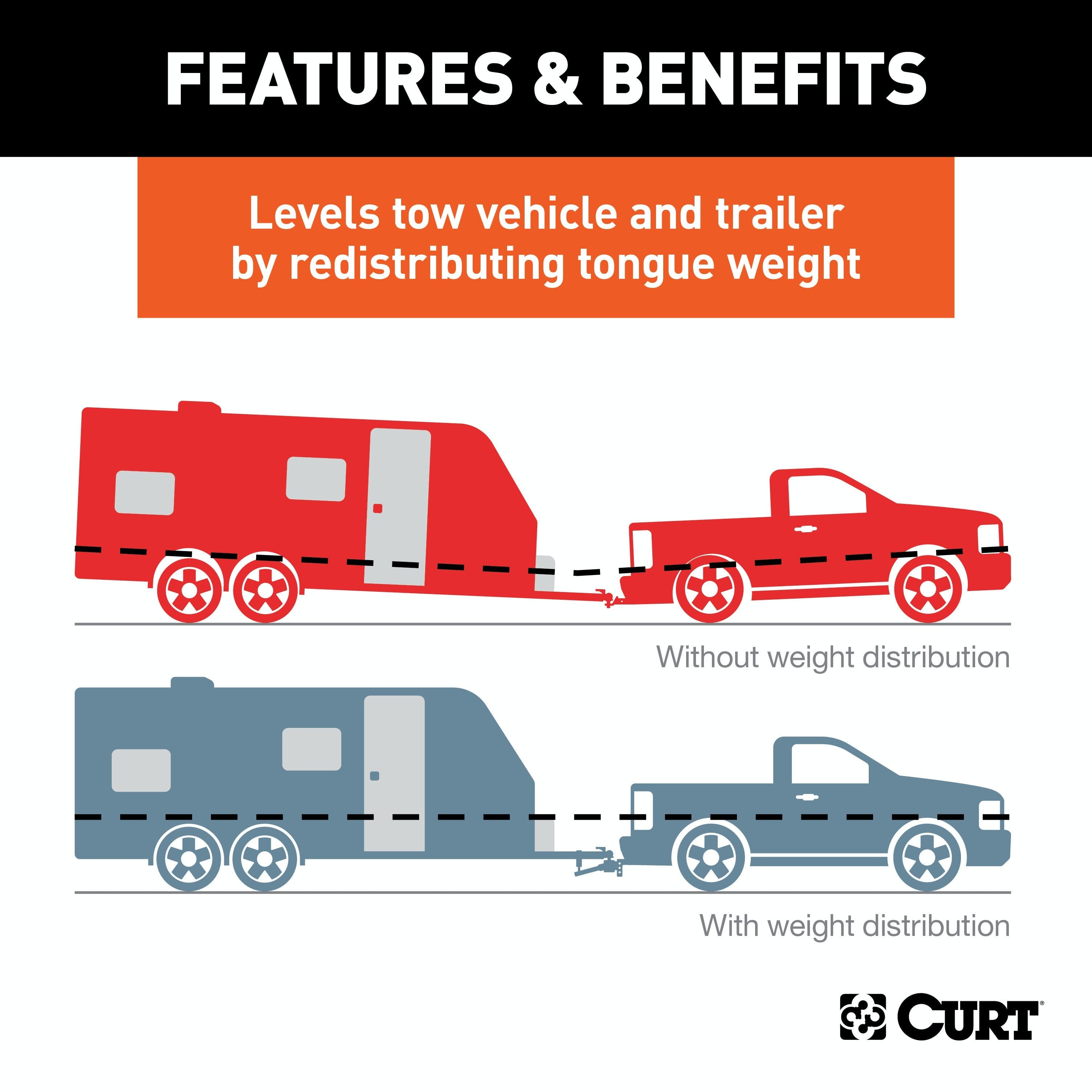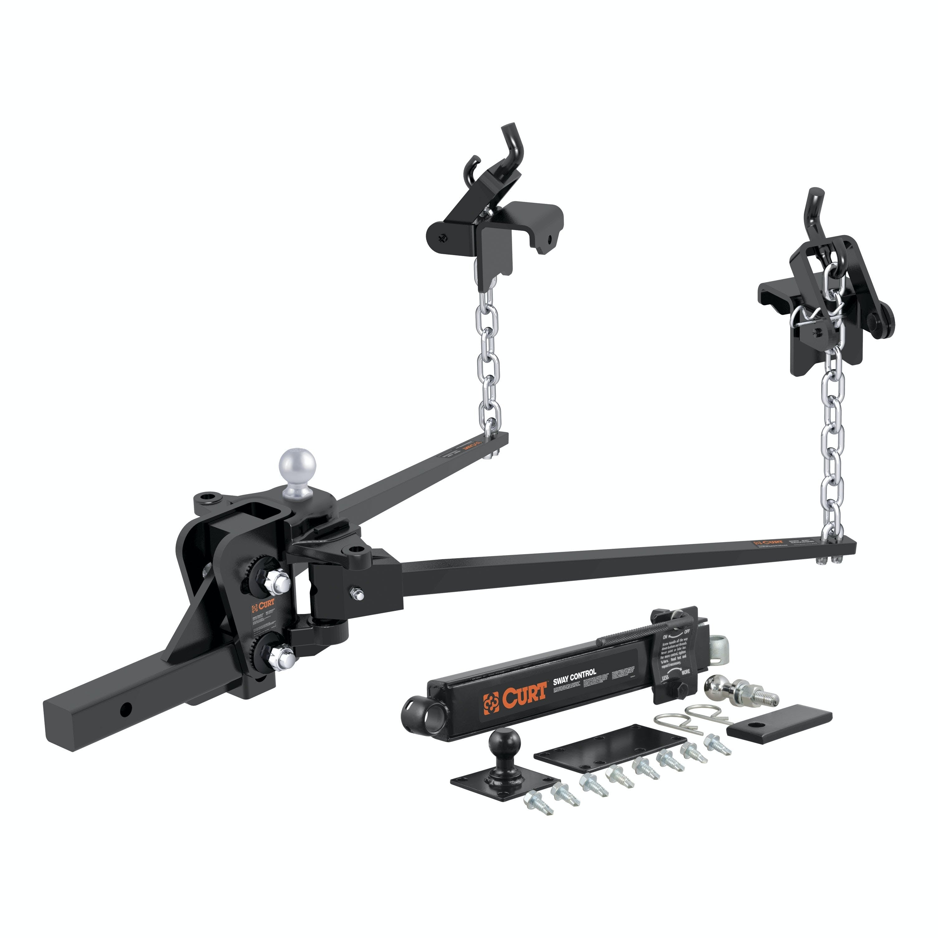 The CURT weight distribution hitch is a specialized towing system that provides improved vehicle and trailer control by leveling the trailer and more evenly distributing its tongue weight across the trailer's and vehicle's axles. Weight distribution hitches are commonly used on travel trailers and campers but can also be applied to other large loads. CURT WD hitches come with a 2 x 2 shank and are compatible with class 3, 4 and most 5 trailer hitches, including Xtra Duty and Commercial Duty (2-1/2 replacement WD shank may be required), as well as some RV trailer hitches. While a weight distribution hitch will increase the gross trailer weight capacity of most trailer hitches, the vehicle's weight carrying capacity must be taken into consideration before towing a heavier trailer (NOTE: Never exceed the lowest weight capacity of any towing component).This trunnion bar weight distribution hitch features a heavy-duty formed head and square spring bars constructed from forged steel. It offers a gross trailer weight capacity up to 15,000 lbs. and a tongue weight capacity of 1,500 lbs. It also includes hook-up brackets, spring bar safety chains, a trailer ball and a pin and clip. To protect this hitch from scratching, chipping, rust and UV damage, it also comes with a durable black powder coat finish. For added sway control, this weight distribution hitch includes a sway control unit. While weight distribution hitches are an effective solution for stabilizing and leveling out your towing rig, they should not be considered a sway control. However, when combined with a CURT sway control kit, the WD hitch maximizes its effectiveness in controlling sway. The sway control kit includes a sway control unit, trailer balls to attach to the trailer and hitch, a reinforcement plate and attachment clips.