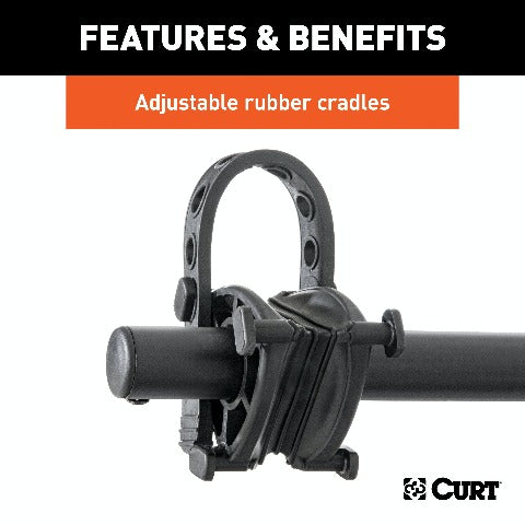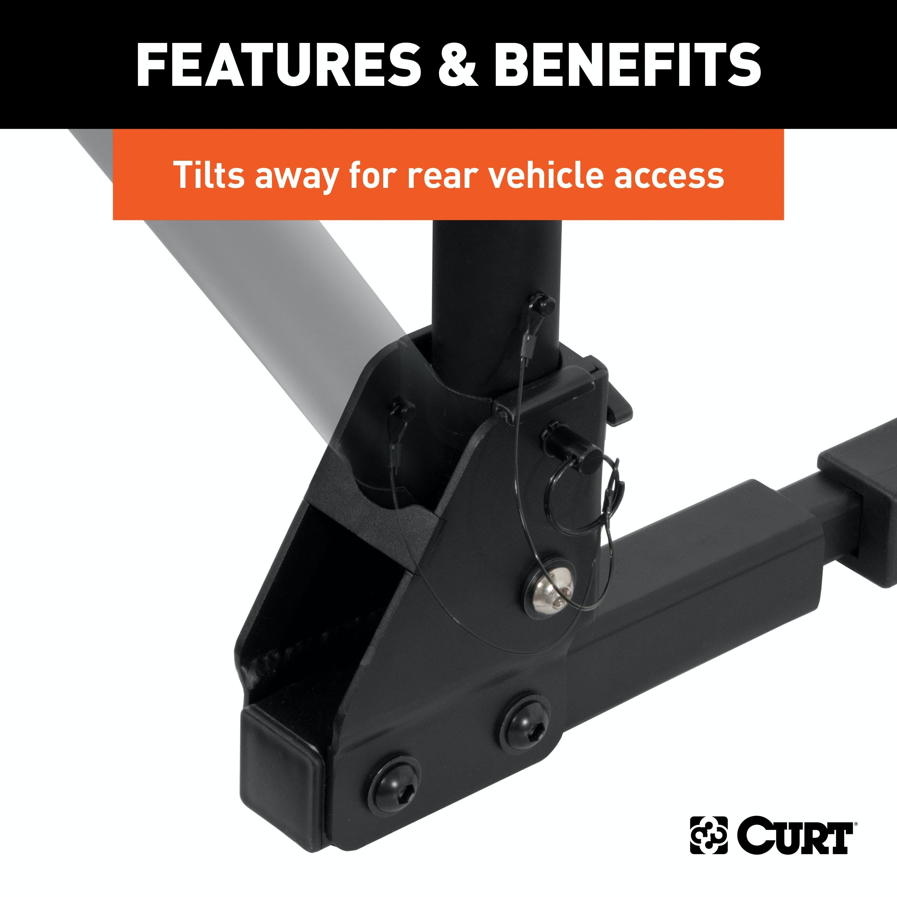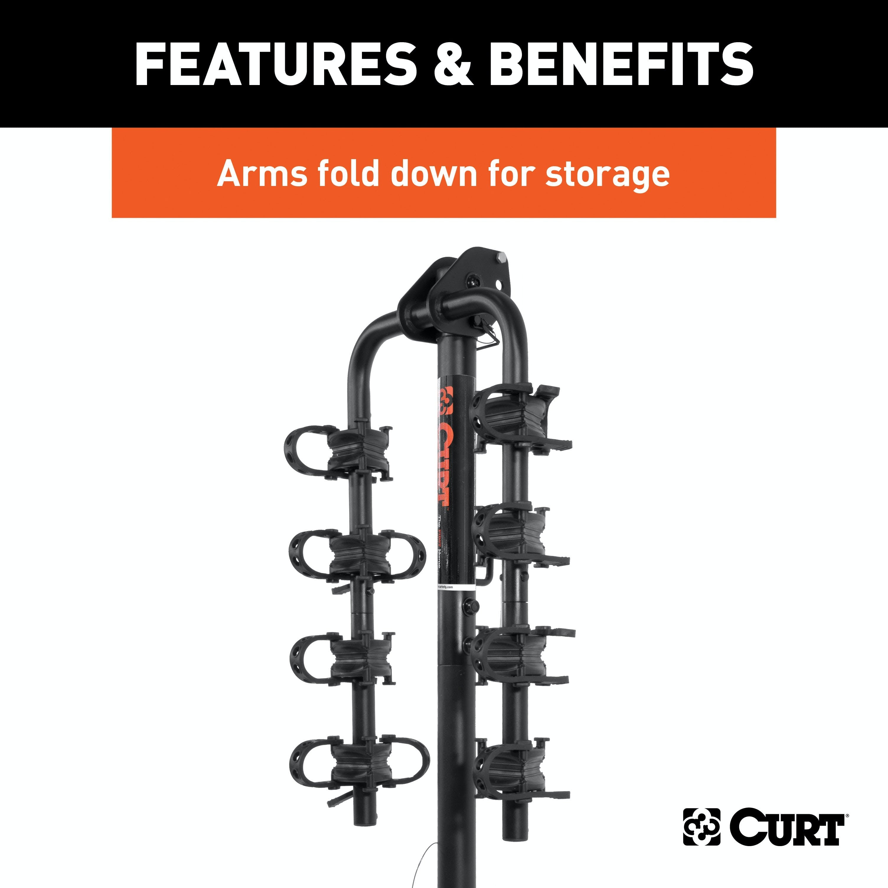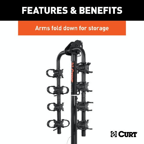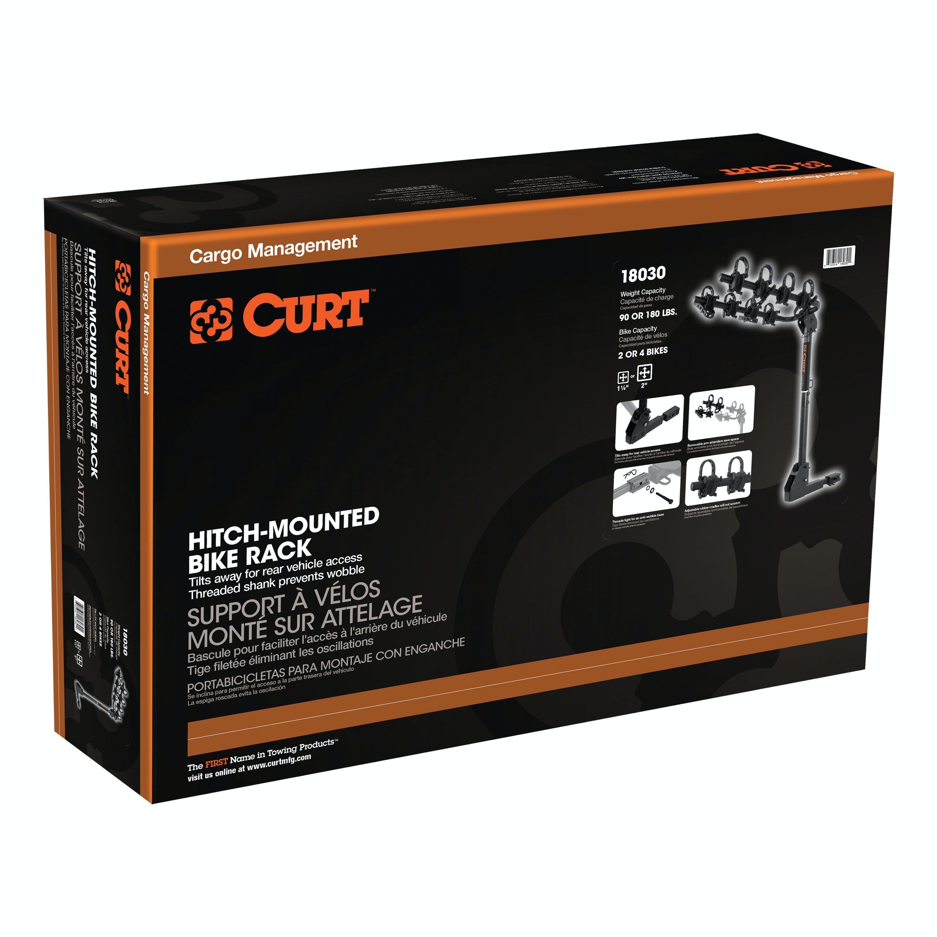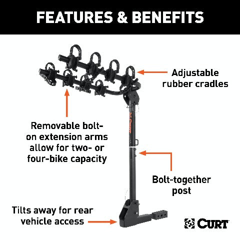 Whether you are an avid mountain biker or a casual rider, you will want CURT along for the ride. CURT bike racks offer both versatility and quality and are available in several different styles to fit your needs. CURT standard hitch-mounted bike racks are anything but average. They feature an adjustable shank to fit either a 1-1/4 or 2 receiver and allow use on most trailer hitch classes. Our standard bike racks also come with several useful features, including an anti-wobble shank to reduce noise and keep bikes more secure, and a compact design for easy storage. They feature adjustable arms to accommodate various bike heights and styles, and the arms can be folded down, when not in use, to remain out of the way. The tilt-down design built into our standard bike racks allows you easier access to the rear of your vehicle whenever necessary. This particular CURT standard bike rack has an extendable design, allowing it to be used as a 2-bike model or 4-bike model. It features a maximum load limit of 90 lbs. or 180 lbs., depending on the configuration. To protect it against the elements and the trail ahead, this bike rack comes with a durable black powder coat finish.