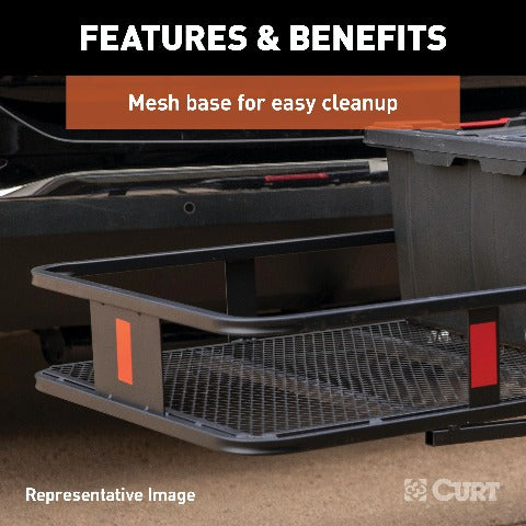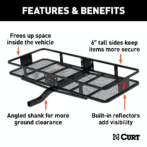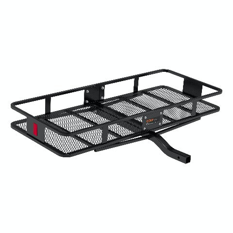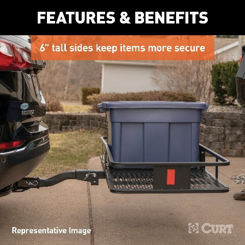 Even with the roomiest of vehicles, packing the car for a long trip can quickly turn into a frustrating game of Tetris. CURT cargo carriers are a simple yet effective solution for maximizing the storage area of your vehicle. The advantage of a hitch-mounted cargo carrier is that it can be mounted on the rear or front end of the vehicle as long as the vehicle is properly equipped with the right receiver hitch. Mounting a cargo carrier in the front opens up the rear receiver hitch for towing a trailer or adding a second carrier or bike rack if needed. The hitch-mounted design also makes installation quick and easy. CURT basket cargo carriers feature a strong bolt-together design and are made with heavy-duty carbide steel and a tubular construction for increased strength. One of the advantages of the basket style is its 6 high sides. These provide extra security and peace of mind during travel. This particular basket cargo carrier features a 2 x 2 bent shank to provide more ground clearance, and it comes with a strong mesh platform to keep items more secure. It can accept up 500 lbs. of cargo and has a durable black powder coat finish to resist rust, scratches and UV damage. Whether you prefer the hitch-mounted carrier or the roof rack option, CURT has cargo management solutions to meet your needs.