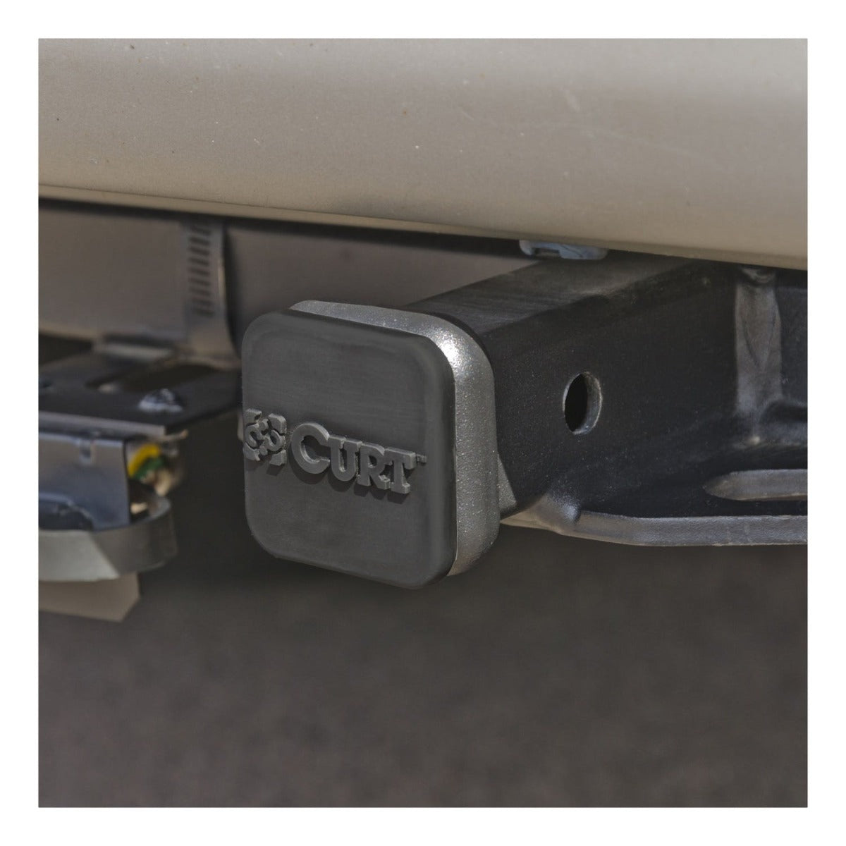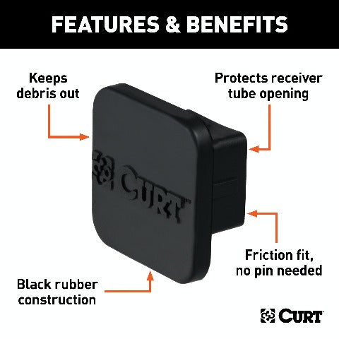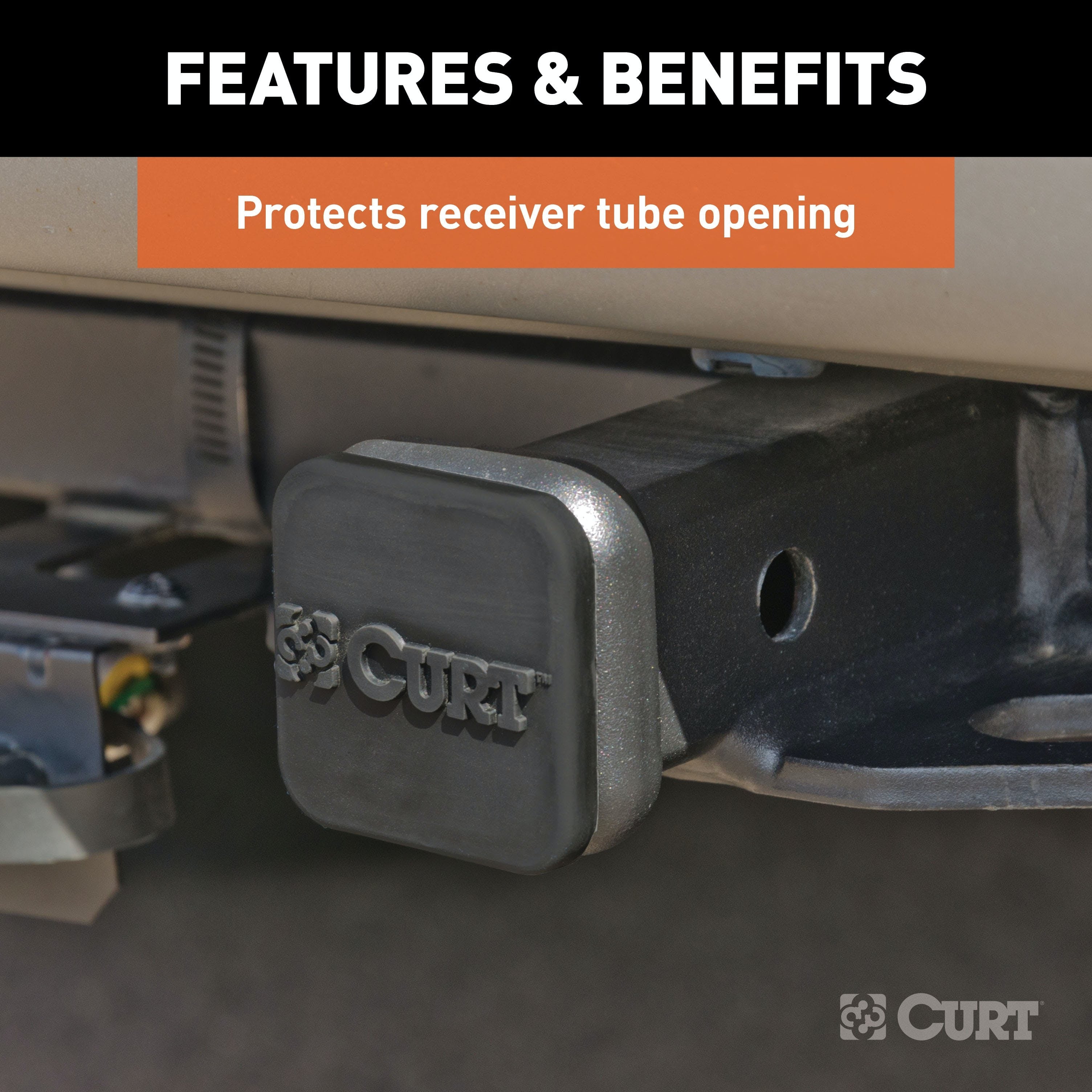 If you own a vehicle with a trailer hitch, you know how quickly the receiver tube can get built up with dirt, debris and road grime. It does not take long before inserting a ball mount or hitch-mounted accessory into your trailer hitch becomes more difficult than it should ever have to be. With enough time and moisture exposure, the inside of a receiver tube can become seized up with rust, making it very difficult to use. Keep your trailer hitch's receiver tube clean and protected when not towing with one of CURT's attractive and durable tube covers. This CURT 1-1/4 x 1-1/4 receiver tube cover is constructed from quality rubber and mounts on your trailer hitch with a friction fit, meaning no hitch pin or clip is required. At CURT, we want to give you a complete towing solution and that includes providing you with the products necessary to maintain your towing equipment. Defend your trailer hitch from the harsh elements with a CURT trailer hitch cover.
