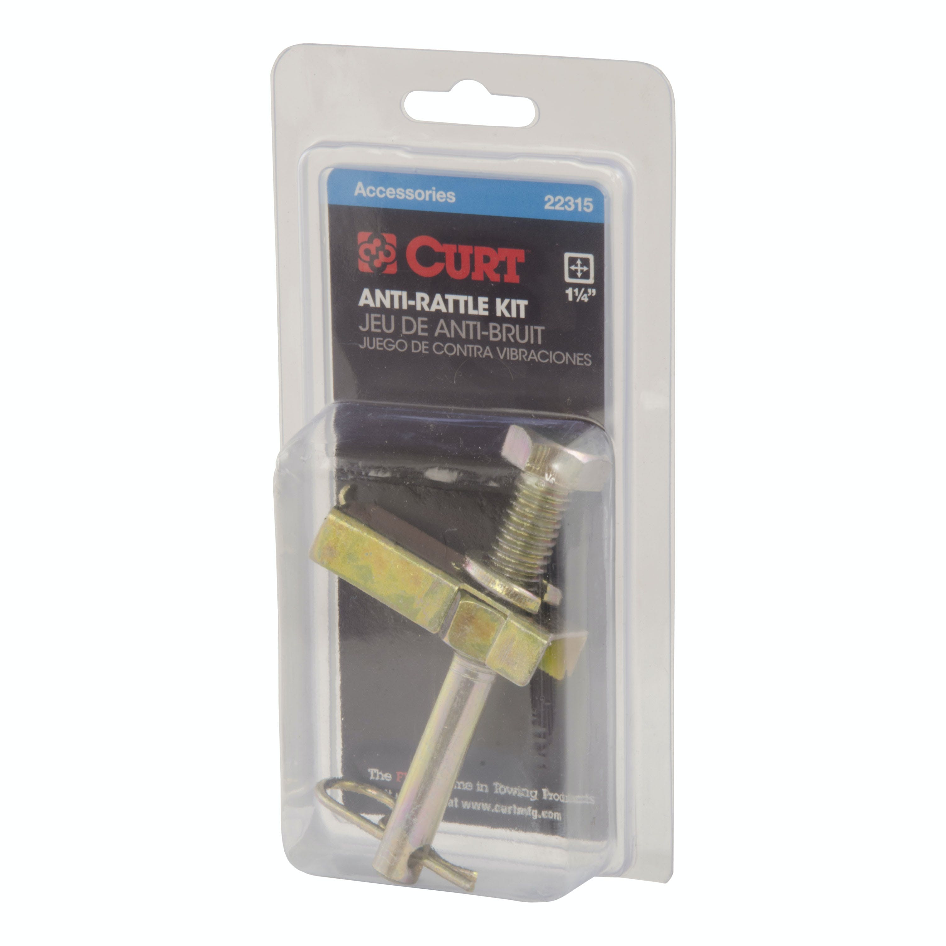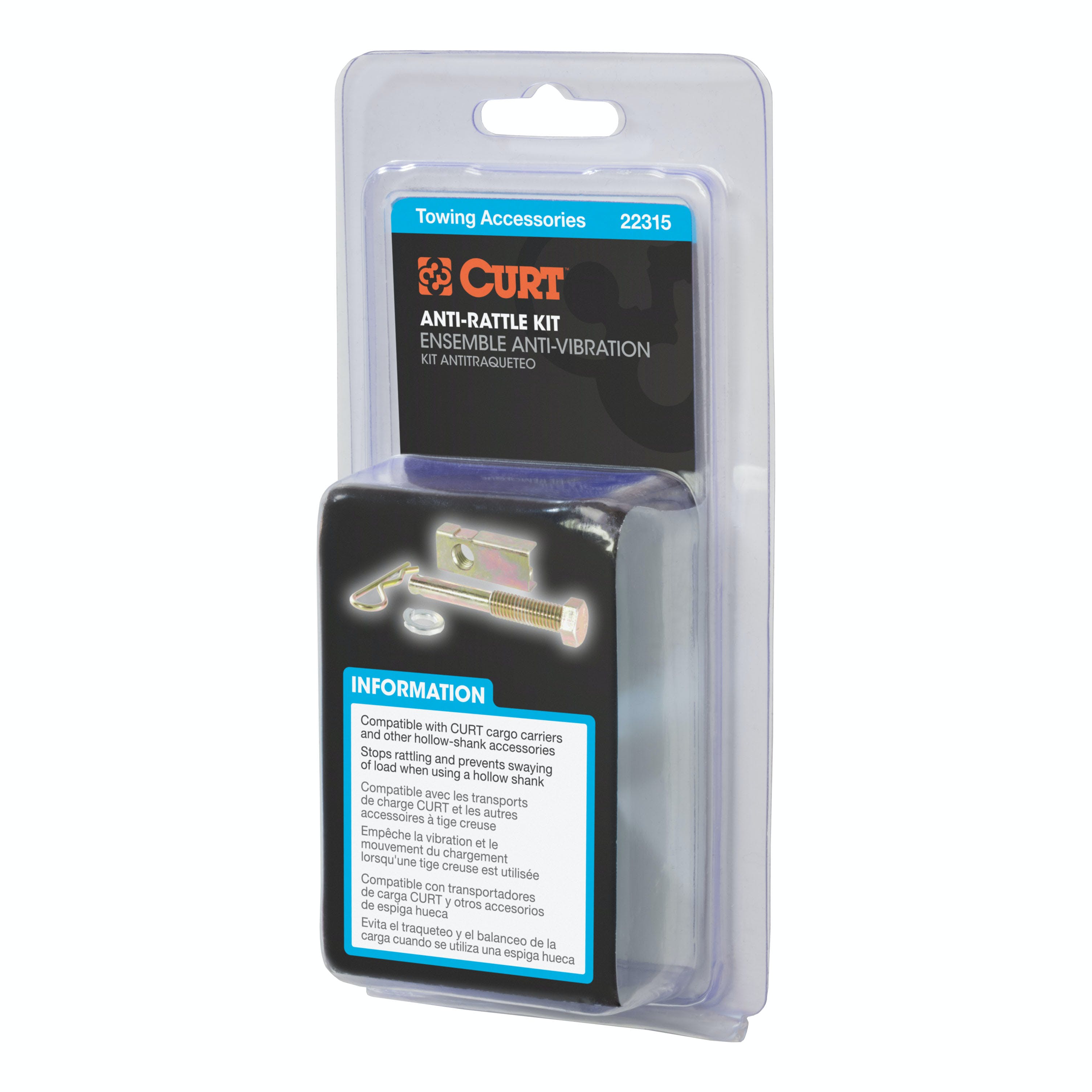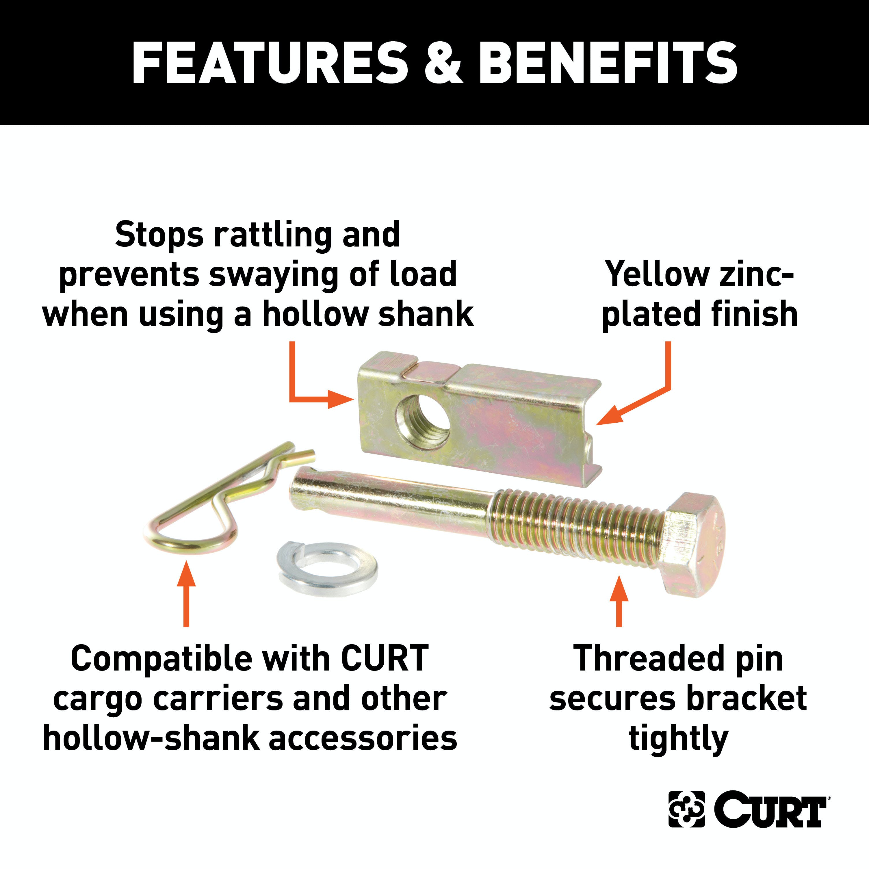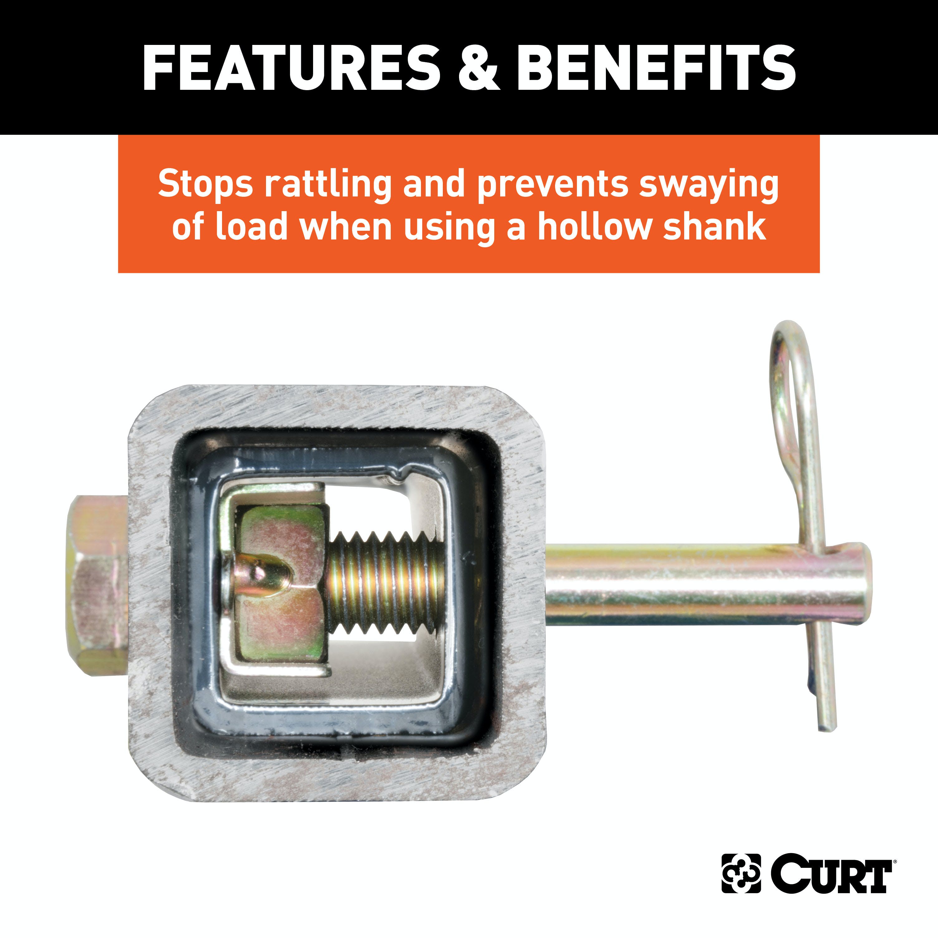 A CURT anti-rattle hitch pin provides smoother, quieter towing by tightening down your trailer hitch connection and deterring noise and vibrations. The anti-rattle kit is comprised of a threaded pin and shim. The shim inserts into the towing accessory shank and can then be installed into the receiver. Then, the threaded hitch pin inserts into the side of the receiver and gets tightened down with a wrench. Together, the hitch pin and anti-rattle shim lock the shank in place and promote a quiet and more enjoyable towing experience. This anti-rattle trailer hitch pin and shim device fit a standard 1-1/4-inch x 1-1/4-inch receiver with a 1/2-inch pin hole. The kit is compatible with hollow-shank accessories only.