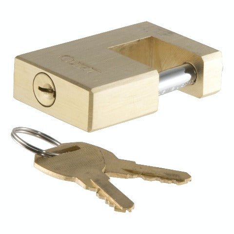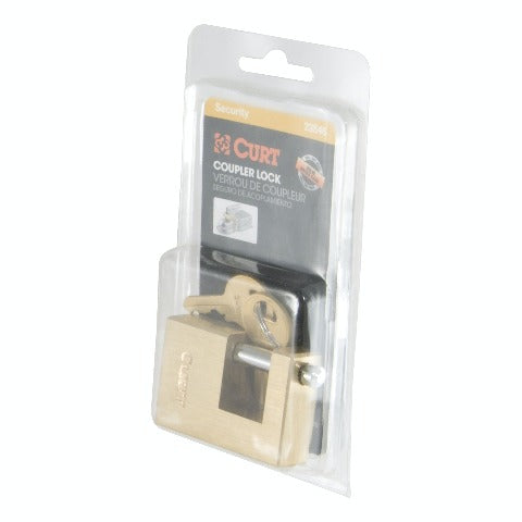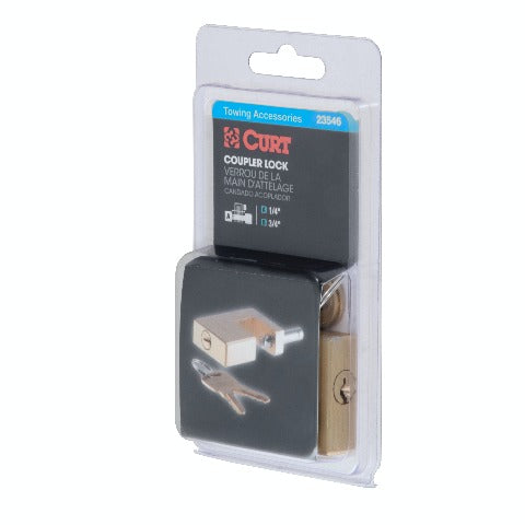 Sometimes a safety pin and coupler latch are just not enough to keep your toys safe. While CURT safety pins and coupler latches are made to keep your coupler securely latched onto your trailer ball, they are no substitute for the locking power provided by a CURT coupler lock. CURT coupler locks are designed to add security to your trailer and towing equipment. Instead of merely retaining the coupler latch mechanism, they lock it into place and greatly deter any tampering and theft of your trailer while it is coupled to your vehicle. CURT coupler locks are key-operated and come in several different styles for you to choose from. This coupler lock features a compact design to keep the pin well protected from tampering. It comes with a solid brass finish and offers a pin span of 3/4 with a pin diameter of 1/4. All CURT coupler locks are made to fit latch-type couplers and include two keys. Protect your boat, your camper and even your utility trailer the right way with a CURT coupler lock.