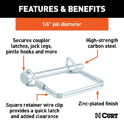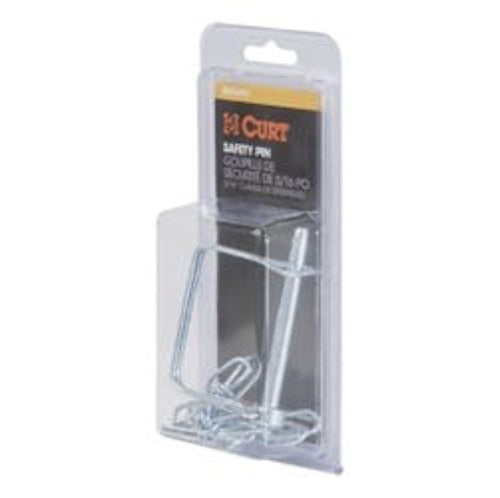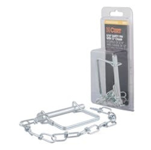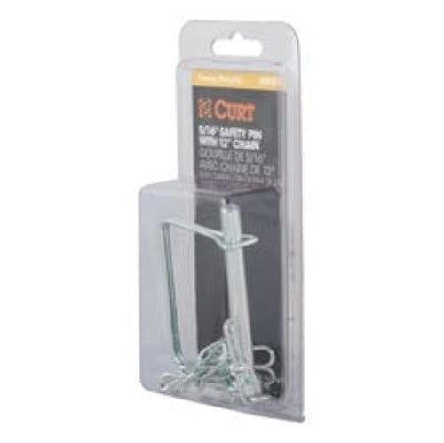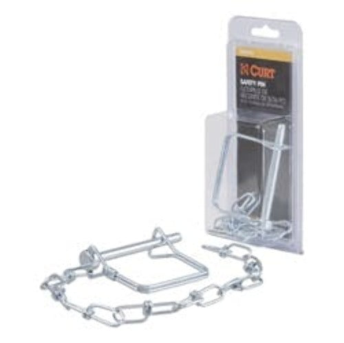 CURT safety pins go beyond the simple function of keeping your coupler latch secure. They are constructed from quality materials and have a universal design that allows them be used for a variety of purposes in your towing setup. CURT safety pins are made from solid steel to provide more than enough strength to keep your trailer coupler latched down tight. The zinc plating that we use to finish our safety pins offers excellent protection against rust and corrosion. This is necessary for any trailer because of its frequent exposure to the elements. The user-friendly design of our safety pins allows them to be easily handled while maintaining effective security. This safety pin has a pin diameter of 1/4. CURT safety pins can also be purchased with a 12 chain attachment to mount onto your trailer coupler and prevent the safety pin from being misplaced. Use CURT safety pins for securing trailer couplers, jacks, caster wheels and more. When you couple your trailer to your vehicle, nuts and bolts just do not cut it. Secure your towing equipment right with a safety pin from CURT.