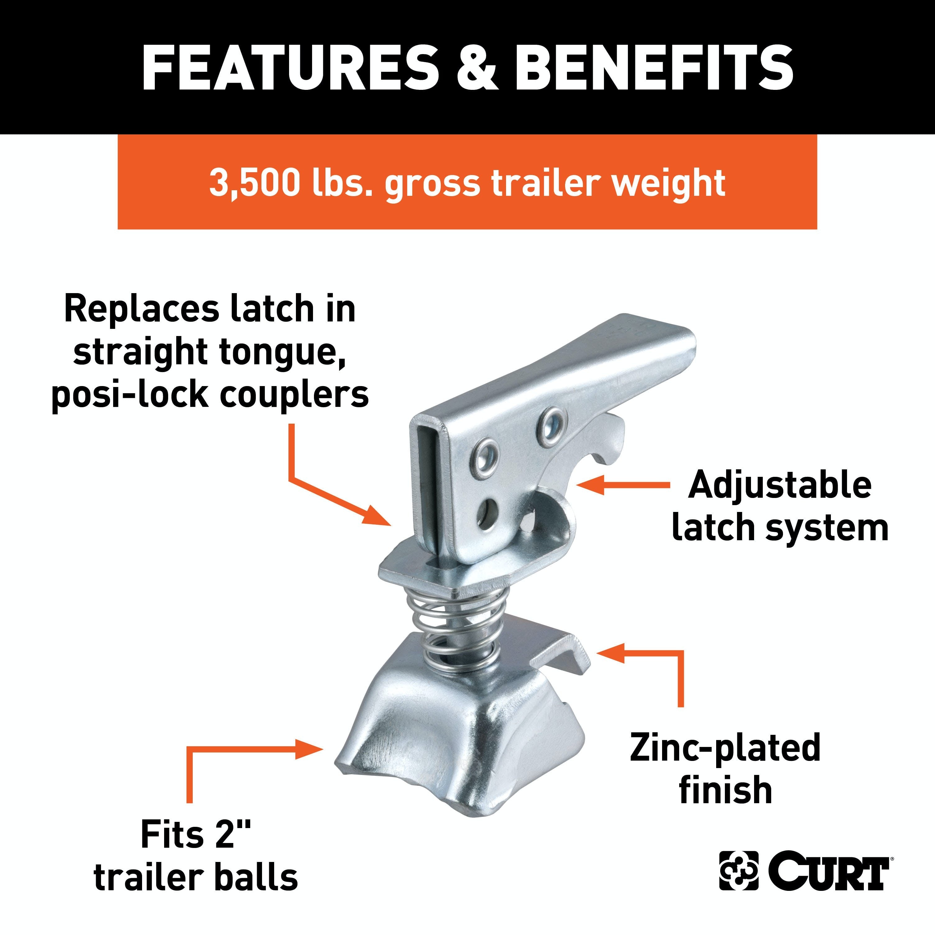 If you are replacing a broken coupler on your trailer or installing a new one on a trailer you are building, CURT has dependable couplers you can trust to keep your tow load latched on tightly. Selecting the right trailer hitch, ball mount and trailer ball to manage the weight of your trailer is not the only important aspect of towing; you also need a trailer that can stand up to the road ahead. That means equipping it with a coupler that is built to go the distance. The CURT replacement Posi-Lock latch is easy to install and fits on our straight-tongue Posi-Lock couplers. It is made from hardy steel construction and has a durable zinc finish to protect from corrosion, wear and tear. A unique features of the Posi-Lock latch is its adjustable design. The lockable latch mechanism adjusts by tightening or loosening a bolt within the latch to ensure a firm hold on the trailer ball. This CURT Posi-Lock repair latch is designed to fit a 2 trailer ball and can be used on 2, 2-1/2 or 3 channel couplers.