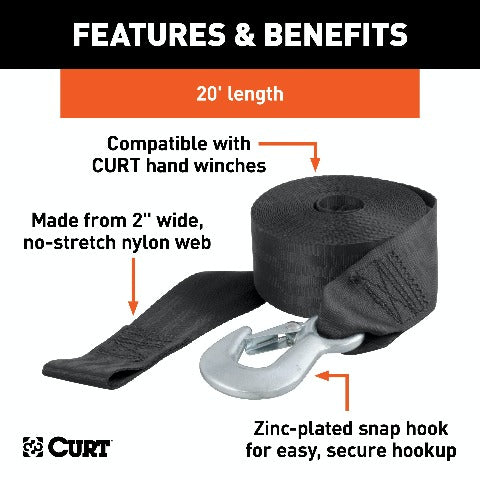 CURT 29007 2-Inch x 20-Foot Nylon Winch Strap with Hook, 4,000 lbs