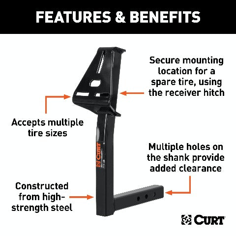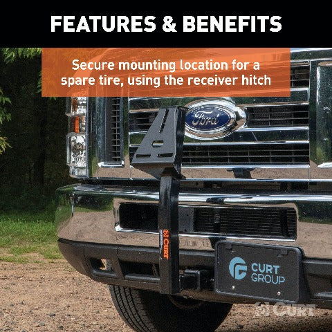 CURT front mount accessories are a unique line of towing accessories that maximize the usefulness of your tow vehicle and give you that added edge on and especially off the road. A CURT front mount trailer hitch is the first step in making your vehicle the ultimate towing machine, and with it comes a variety of towing possibilities you might not even know exist. The CURT spare tire mount inserts into the 2 x 2 receiver tube opening of your trailer hitch and allows you to attach a spare tire onto the front end or rear of your truck, van or SUV. It measures 24 from top to bottom and features multiple mounting holes on the shank to provide plenty of clearance for your bumper and the rear of your vehicle. The CURT spare tire mount is designed to mount onto a variety of vehicles and to accept a number of different wheel types. It is especially useful for off-roading situations and for creating a little extra cargo room inside your vehicle (NOTE: Mounting hardware for the spare tire is not included).