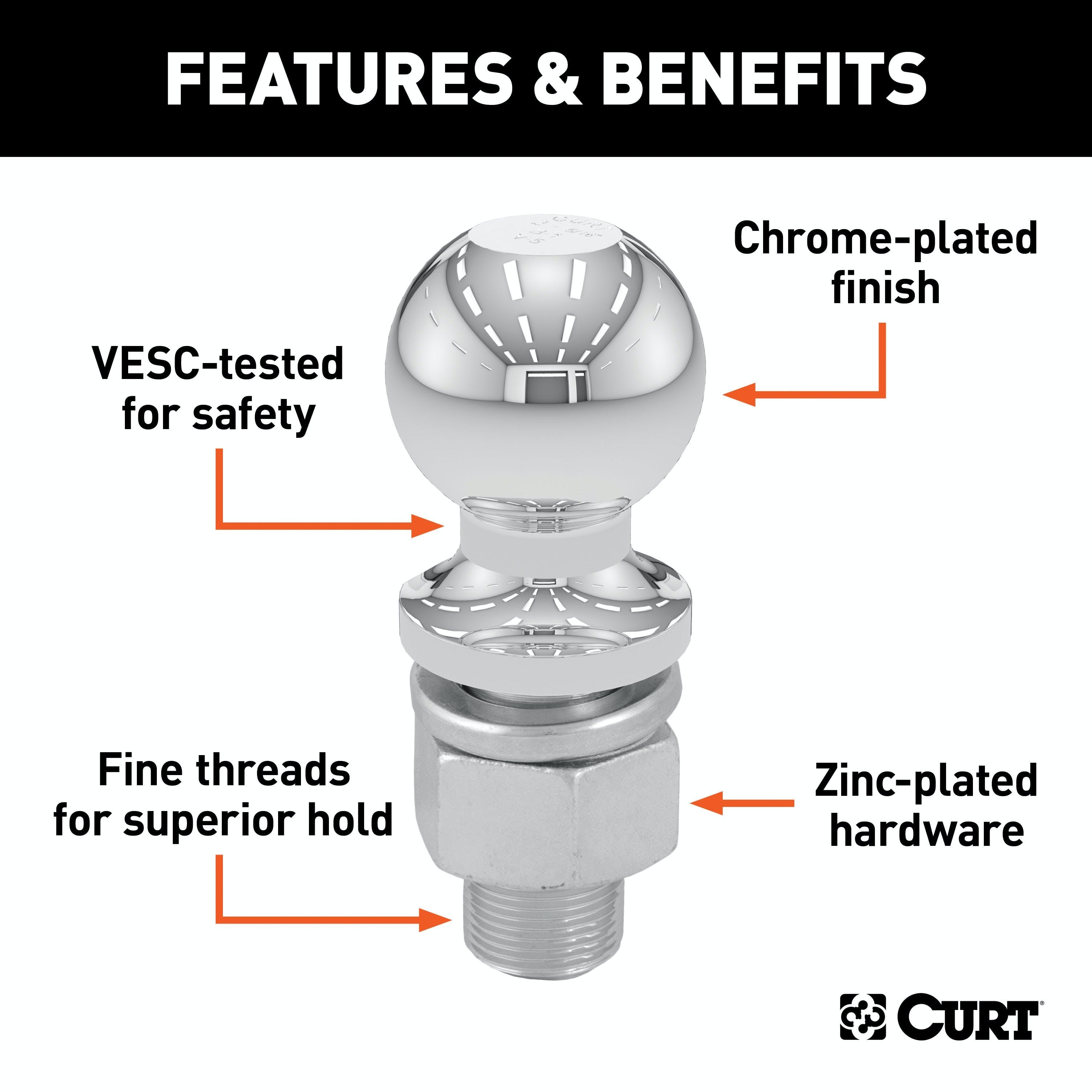 CURT 1-7/8 trailer balls are constructed from high-strength steel to match the towing power of your class 1 or class 2 trailer hitch and ball mount and come with fine threads on the shank for improved holding strength. Having a trailer ball that matches your coupler size is absolutely essential. At CURT, we engineer our trailer balls to be precisely fitted. When we stamp 1-7/8 into the top of each hitch ball, we actually mean 1-7/8.This CURT tow ball features a ball capacity of 2,000 lbs. It is able to tow most utility trailers, boat trailers, campers, smaller livestock trailers and some recreational vehicle haulers (NOTE: Never exceed the lowest weight capacity of any towing component; i.e. the vehicle, hitch, trailer, etc). As with any trailer, be sure that your towing equipment is capable of handling the load before hitching up. This trailer ball also features a 3/4 shank diameter, a 1-5/8 shank length, 0 of rise and a nickel-chrome finish to protect against corrosion and wear. Like all CURT trailer balls, our 1-7/8 balls are tested for your safety and meet all U.S. VESC specifications.