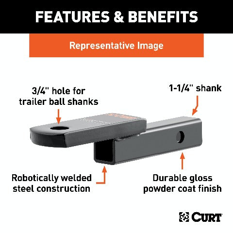 CURT class 2 ball mounts are designed to be fast, easy and reliable for your light-duty or standard-duty towing needs. We produce our class 2 ball mounts using state-of-the-art CNC machinery and robotic welding. This provides the accuracy and consistency in our ball mounts that we pride ourselves on and ensures that you receive the exact towing product you expect from an industry-leading manufacturer. Like our class 1 ball mounts, CURT class 2 ball mounts are all made with 1-1/4 x 1-1/4 shanks and have a 3/4 trailer ball hole. A CURT class 2 ball mount is an excellent choice for full-size sedans, minivans, crossover SUVs and other vehicles that commonly use a class 2 trailer hitch. They are ideal for towing small boat trailers and utility trailers, popup campers and some recreational vehicle trailers such as those used to haul dirt bikes, motorcycles and ATVs (NOTE: Never exceed the lowest weight capacity of any towing component; i.e. the vehicle, hitch, trailer, etc).This CURT class 2 ball mount has a gross trailer weight capacity of 3,500 lbs. and a tongue weight capacity of 350 lbs. It measures 7-1/4 long, has a rise of 2-5/8 and a drop of 3-1/4. To give our class 2 ball mounts the edge they need to go wherever the road takes you, we coat each one in a highly durable black powder coat that provides a long-lasting defense against rust, UV damage, scratching, scuffing and chipping.