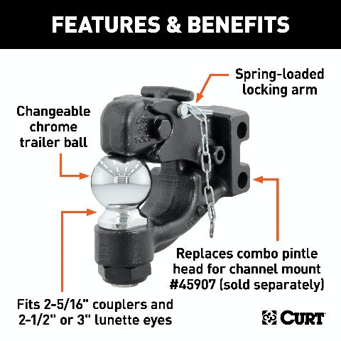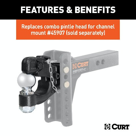 This replacement ball and pintle combination head offers versatile towing options and is designed to fit the CURT adjustable channel mount #45907. It features a standard 2-5/16-inch diameter trailer ball to fit any 2-5/16-inch trailer coupler. With its integrated spring-loaded arm, the ball-pintle combination can also be coupled to a 2-1/2-inch or 3-inch lunette ring (inside diameter). NOTE: Includes pintle attachment only. Channel mount sold separately.