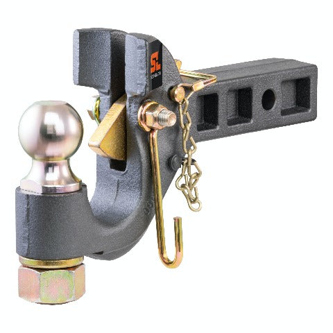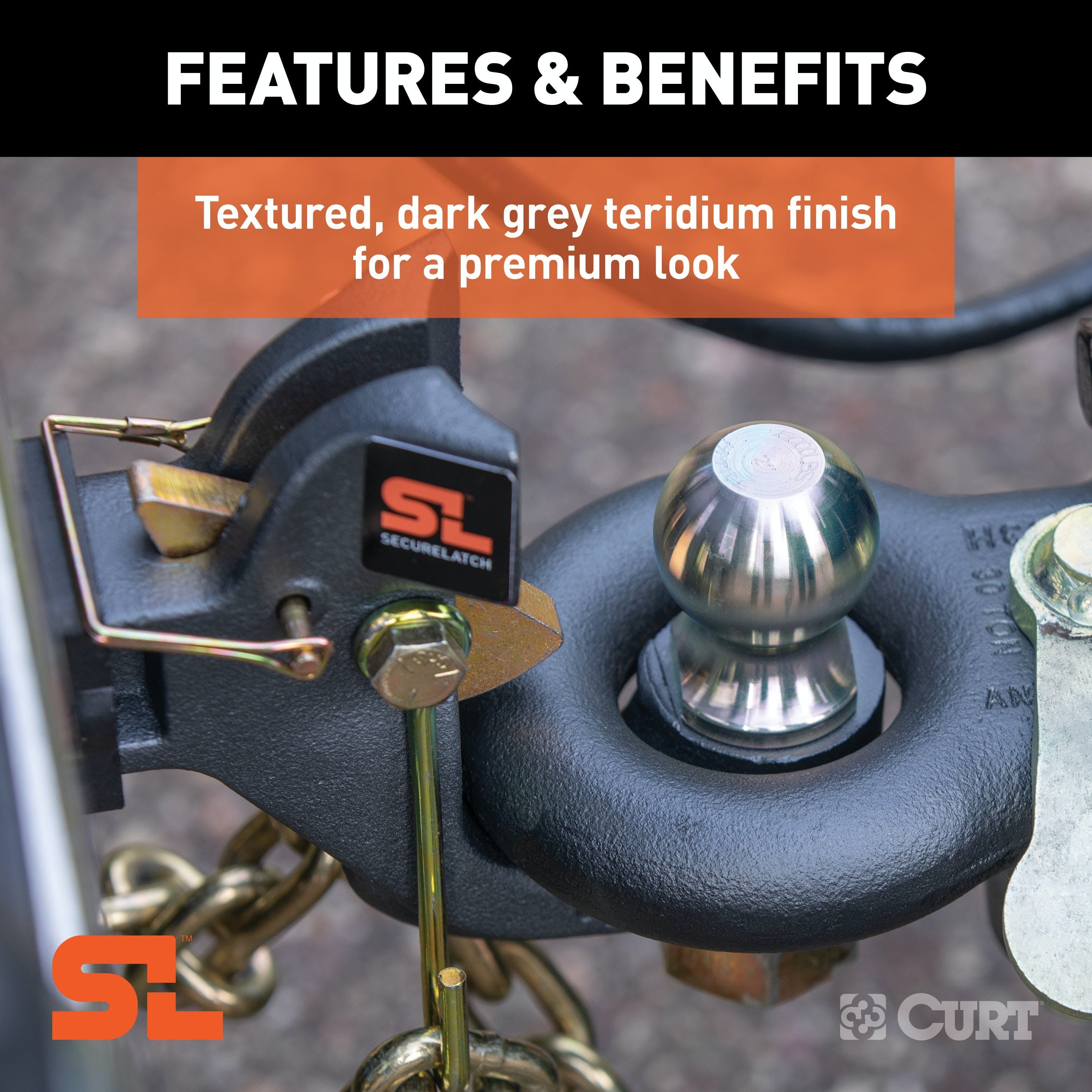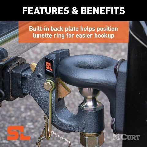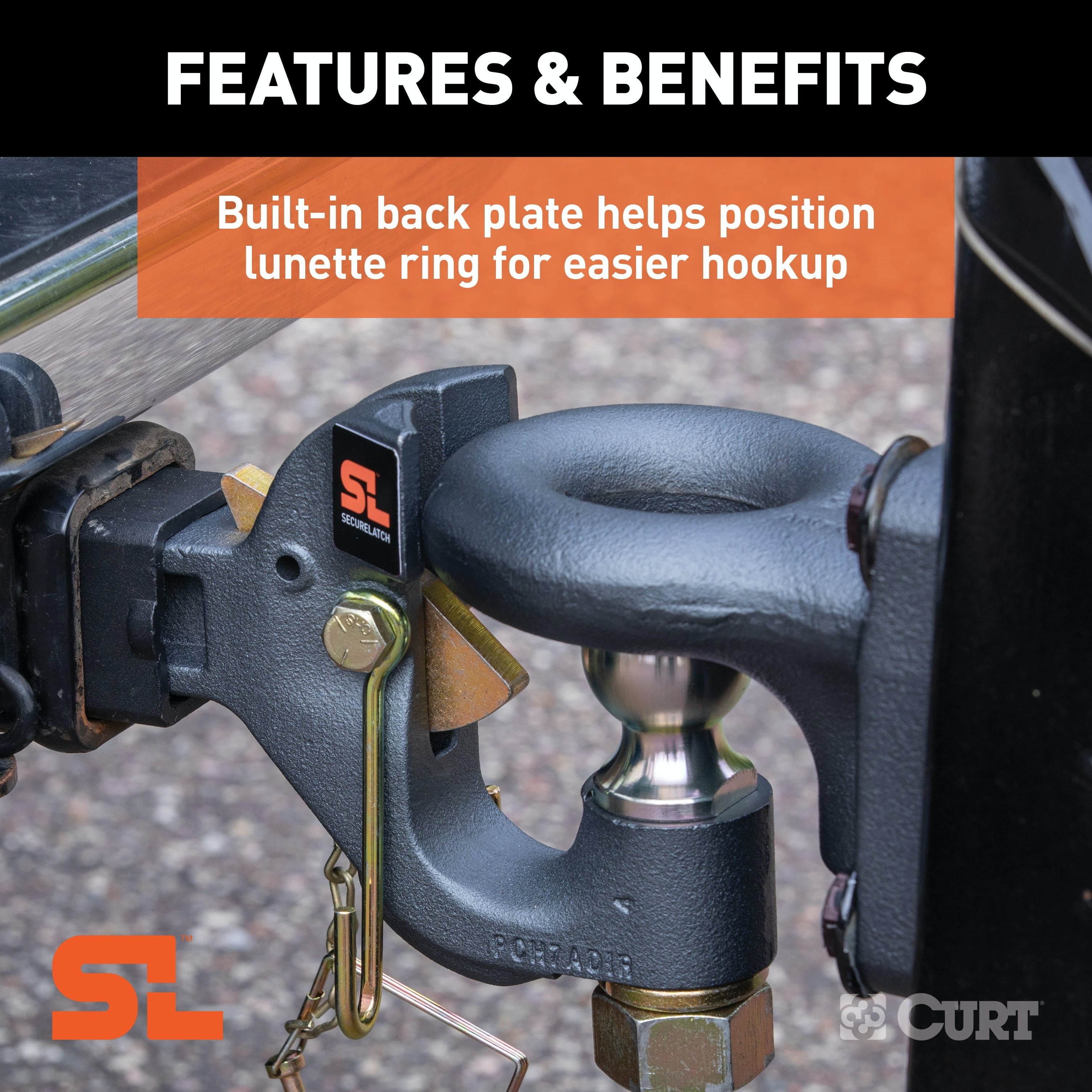 The CURT SecureLatch pintle ball hitch makes coupling to your trailer virtually automatic with its innovative auto-locking technology. The auto-lock automatically latches the lunette ring onto the hook without any manual coupling required. Strike the integrated back plate, drop the lunette ring down onto the hook and you're ready to tow -- just insert the secondary safety pin! This SecureLatch ball and pintle hook combination also has a unique, cupped design to hold the lunette ring more tightly, greatly reducing chucking noises common in pintle towing. This pintle hitch is rated for 14,000 pounds gross trailer weight and 10,000 pounds ball capacity. It fits any industry-standard 2-inch receiver. The ball and hook combo can be coupled to a 2-inch standard coupler or 2-1/2-inch or 3-inch diameter lunette rings.