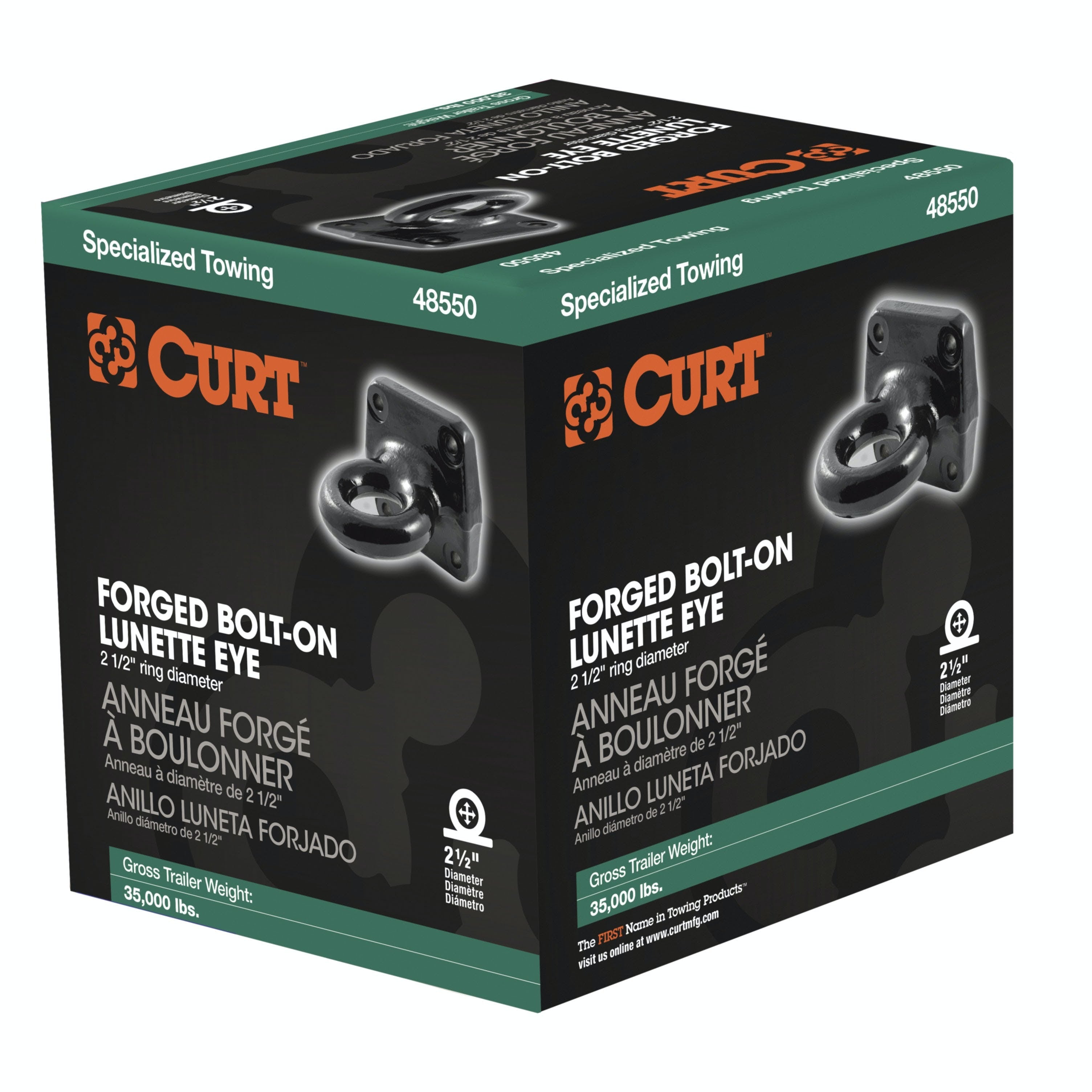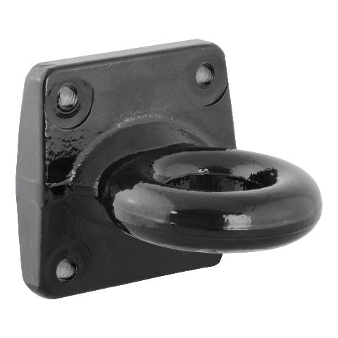 In agriculture, construction and even military applications, pintle hitches are the trusted product of specialized towing. They are notorious for their high weight capacity and simple design. The basic pintle hitch is essentially a hook and loop, with the hook attached to the vehicle and the loop mounted on the trailer. Because of their simple design, pintle hitches are able to have thicker metal construction and more secure coupling. CURT has a wide variety of pintle hitches and pintle-style products to give you a complete solution for your heavy-duty towing needs. This lunette eye uses a four-bolt mounting system to install on an adjustable pintle mount, allowing for easy height adjustment and trailer levelling. It features a forged steel alloy construction and boasts a gross trailer weight capacity of 35,000 lbs. (NOTE: Never exceed the lowest weight capacity of any towing component; i.e. the vehicle, hitch, trailer, etc). With a 2-1/2 inside diameter, this lunette ring fits a variety of CURT pintle hooks and ball and pintle combinations. The heavyweight towing done with pintle hitches implies a certain amount of wear and tear on your towing equipment, and to prepare for this, CURT uses a quality finish on all our pintle mounts, lunette eyes and combination pintle hitches. This lunette eye is coated in a tough black powder coat finish to provide the perfect amount of rust and scratch resistance needed to face the heavy-duty towing you do every day.
