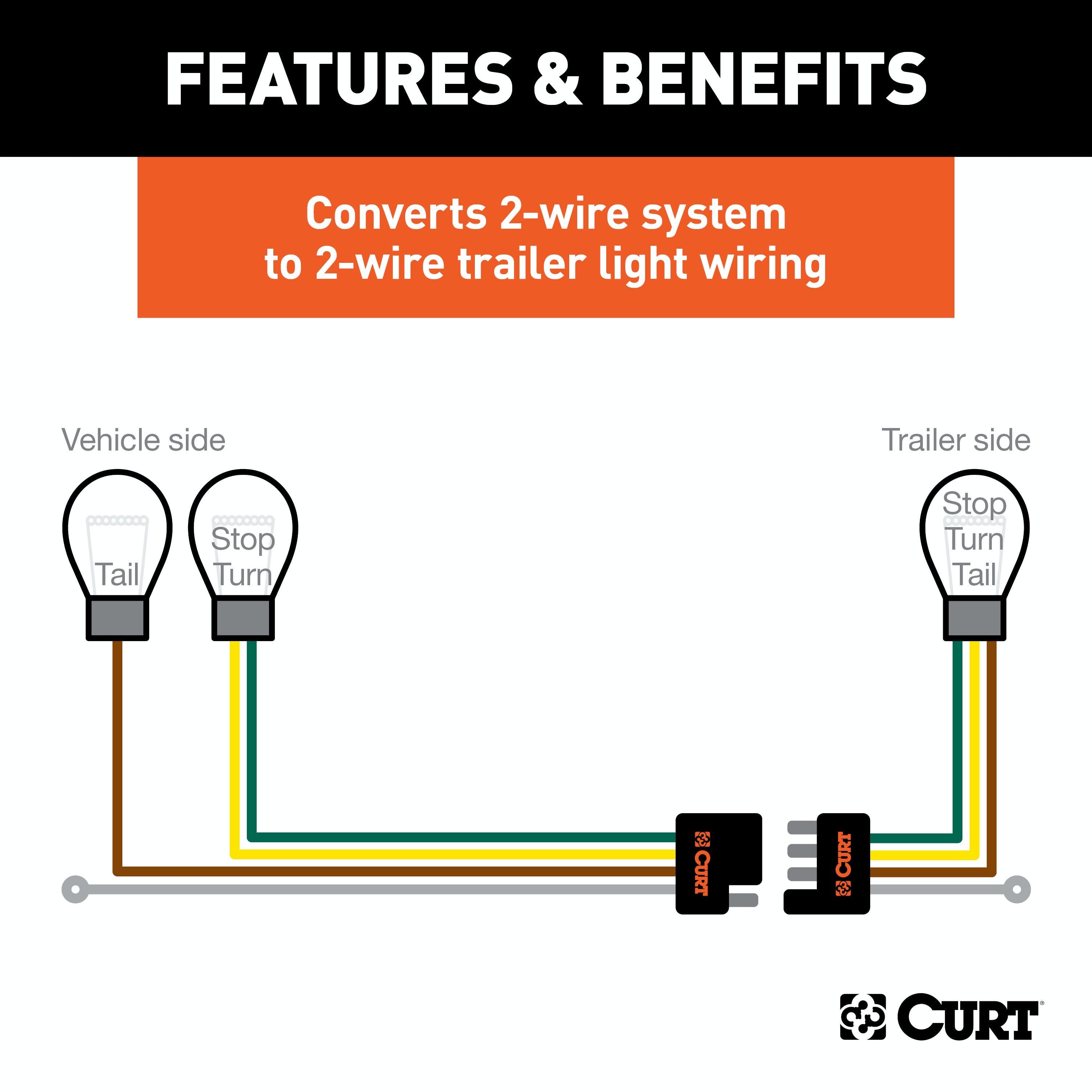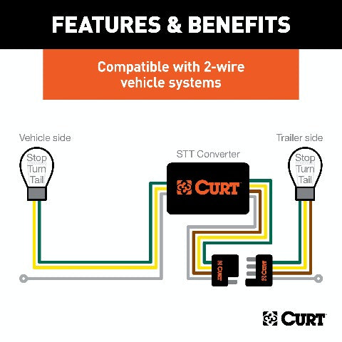 Rain, road grime and salt can deal a vicious blow to your trailer wiring, and it takes electrical components with an extra-thick shell to stand up to the elements. The CURT multi-function electrical converter is an advanced taillight converter that offers the ultimate in vehicle compatibility and weather resistance, giving you a reliable wiring connection any season of the year. The potted design seals the internal electrical components in a watertight enclosure and is filled with a solid compound to protect against impacts, vibrations and moisture for long-lasting use, even on the exterior of the vehicle. The converter also features our advanced surface mount technology (SMT), using smaller components mounted directly to the surface of the circuit board. This produces lower resistance, reduced heat generation, longer life cycles and higher reliability. The CURT multi-function electrical converter comes with pigtail wires that are able to be spliced into two-wire, three-wire or PWM wiring system with combined stop and taillights. It converts any of these systems to a simple two-wire system, using a standard 4-way flat output, to be compatible with most trailer wiring. The converter is controlled using a microcontroller that is able to sense the current passing through it, allowing for quick reaction to dangerous conditions such as overload and short circuits. It also filters unwanted input signals to protect your wiring systems and uses a mere seven volts for low-voltage operation. The CURT multi-function taillight converter is a heavy-duty electrical converter for virtually any vehicle-trailer combination. It comes with color-coded wires and an easy-to-read wiring guide, as well as a dust cover to protect the 4-way flat connector. This package also includes four snap locks for faster, more secure splicing. A powered converter wiring kit #55152 is also required for installation.