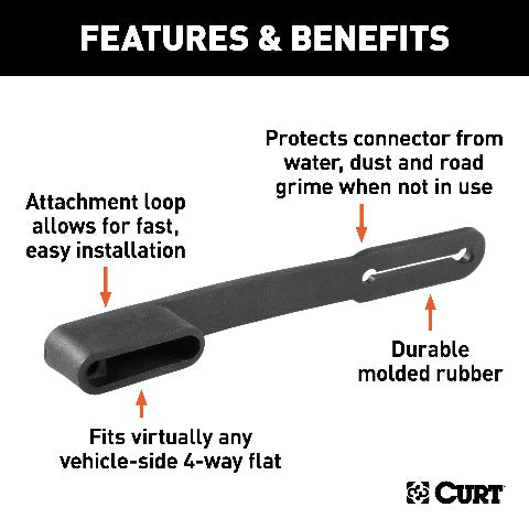Like trailer hitches and ball mounts, electrical connectors range all over the board in shape, size and capability, but no matter what your trailer's electrical functions are, you need a solid connection to keep the power flowing and ensure safety on the road. CURT electrical connectors are designed and manufactured to give you a reliable connection every time you plug in your trailer. Protect your vehicle-to-trailer wiring connection with a CURT electrical socket cover. This 4-way flat dust cover is made with durable plastic to easily resist the elements and help maintain good connectivity. It comes with a convenient attachment tab to avoid loss and is specifically designed to fit a 4-way flat socket on the vehicle side of the connection.