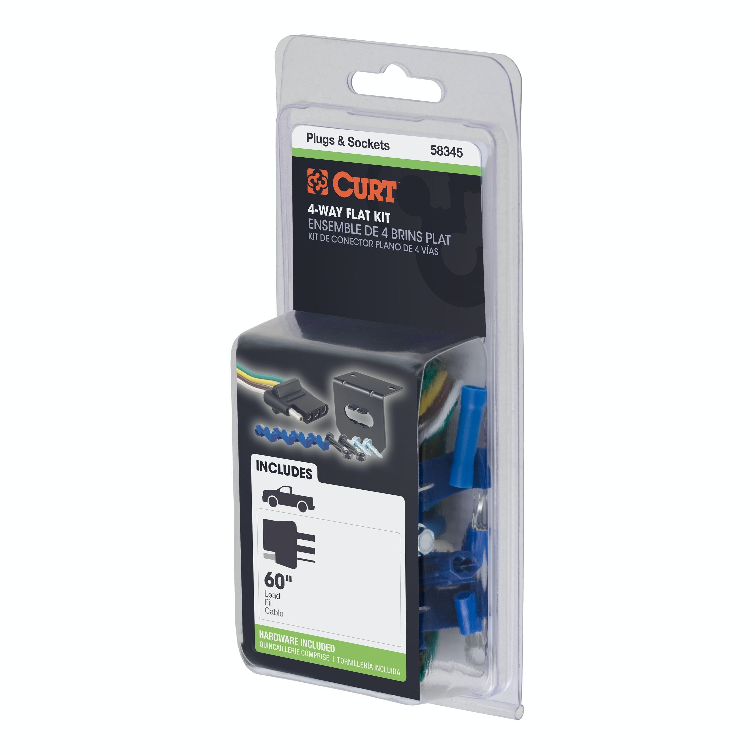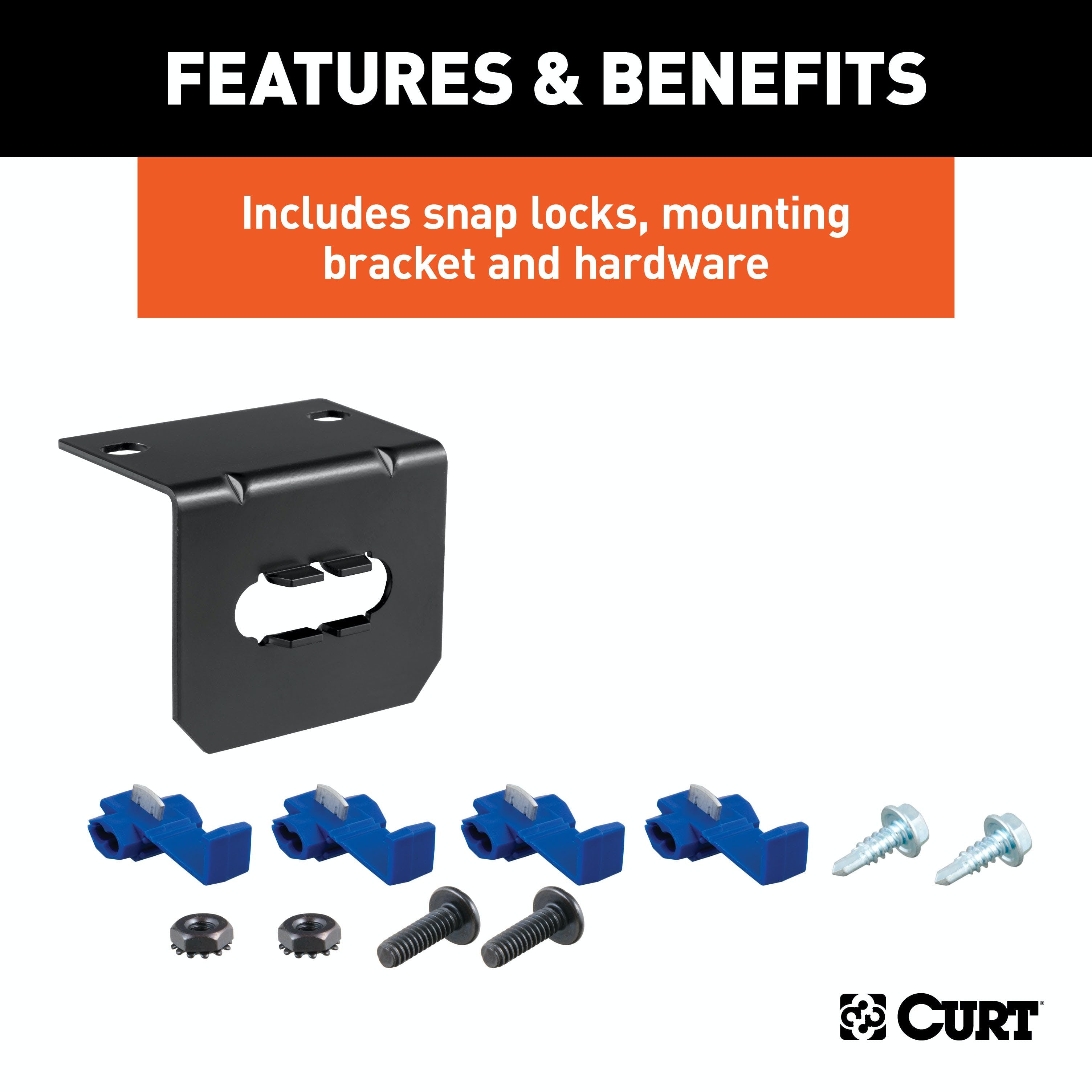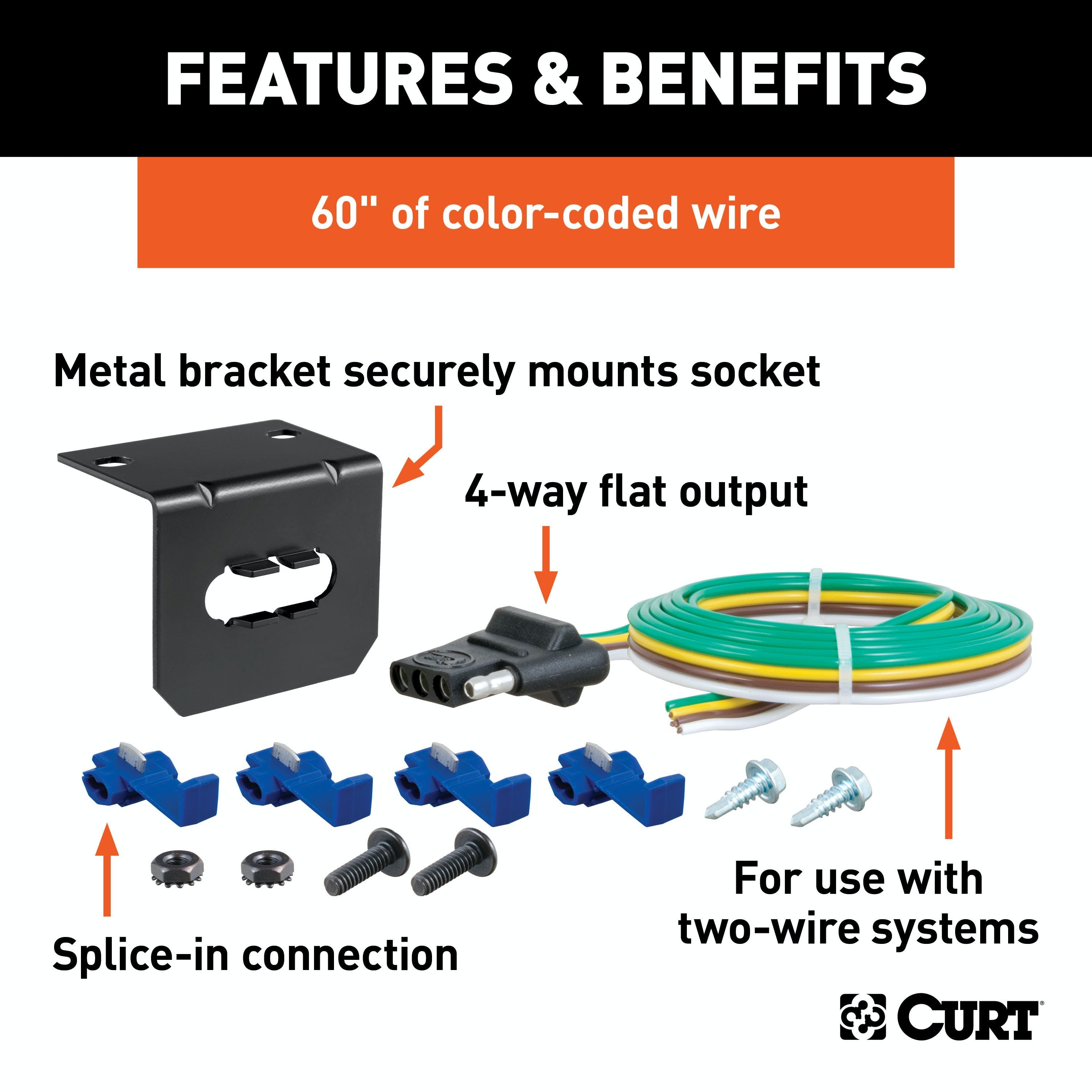 Like trailer hitches and ball mounts, electrical connectors range all over the board in shape, size and capability, but no matter what your trailer's electrical functions are, you need a solid connection to keep the power flowing and ensure safety on the road. CURT electrical connectors are designed and manufactured to give you a reliable connection every time you plug in your trailer. This 4-way flat connector is designed to supply power for tail lights, turn signals and brake lights, as well as a ground connection. It features durable rubber-molded construction and is made with standard color-coded, bonded wire. It also includes snap locks, a mounting bracket and all necessary installation hardware to easily splice into your vehicle's wiring system and mount on the rear of your vehicle. This 4-way flat connector is a female-end socket, specifically designed for the vehicle side of the connection. It is compatible with all 2-wire vehicle systems.