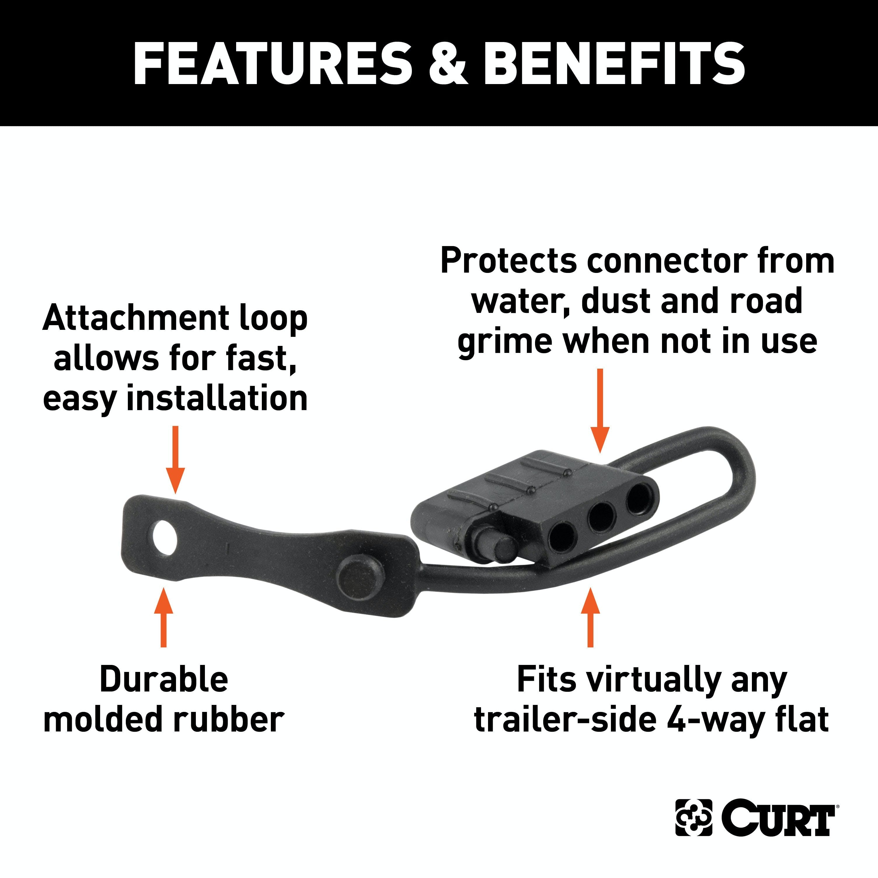 Like trailer hitches and ball mounts, electrical connectors range all over the board in shape, size and capability, but no matter what your trailer's electrical functions are, you need a solid connection to keep the power flowing and ensure safety on the road. CURT electrical connectors are designed and manufactured to give you a reliable connection every time you plug in your trailer. Protect your vehicle-to-trailer wiring connection with a CURT electrical plug cover. This 4-way flat dust cover is made with durable black rubber to easily resist the elements and help maintain good connectivity. It comes with a convenient attachment tab to avoid loss and is specifically designed to fit a 4-way flat plug on the trailer side of the connection.