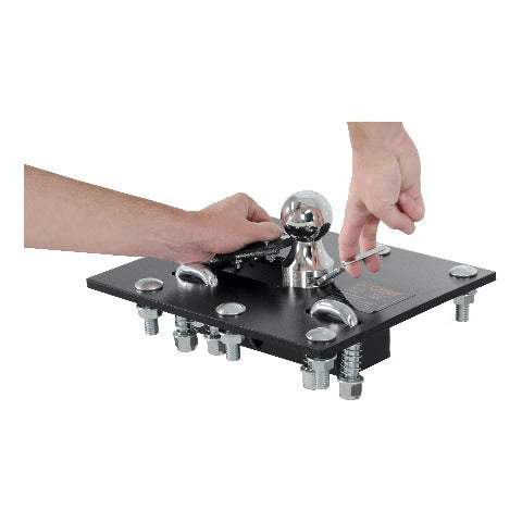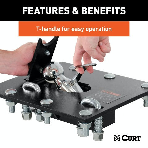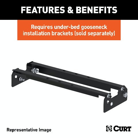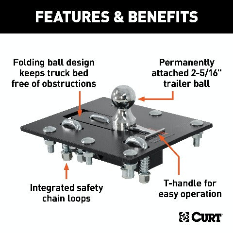The CURT folding ball gooseneck hitch is an innovation in gooseneck technology, offering a unique solution to the problem of a misplaced or stolen trailer ball. Rather than having a fixed trailer ball that obstructs your truck bed space or a removable ball that locks into place using a set of pins, a folding ball gooseneck hitch features a permanently attached ball that hinges down into a small compartment within the hitch. When folded down, the gooseneck ball remains out of the way and allows you to make full use of your truck bed. When folded back up again, it provides a reliable towing connection for your gooseneck trailer. No matter which position the ball is in, it remains fixed to your pickup truck, deterring theft and preventing loss. The CURT over-bed folding ball gooseneck hitch is just another example of CURT quality and ease of use. This durable hitch has a gross trailer weight capacity up to 30,000 lbs. and a tongue weight capacity of 7,500 lbs. A 2-5/16 trailer ball, 3/8 thick top plate, six-hole mounting design and U-bolt safety chain hookups ensure that your trailer and payload stay securely attached. The folding mechanism of the over-bed folding ball gooseneck hitch features a stainless steel safety pin and pivot spring to prevent binding, and it comes with a T-handle to make operation of the ball quick and easy. To top things off, we finish each over-bed folding ball gooseneck hitch in a durable carbide powder coat to resist rust and give it a limited lifetime warranty for peace of mind