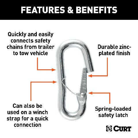 There are always some factors on the road you cannot control -- an irresponsible driver, adverse weather conditions -- but one thing you can control is the type of towing equipment you use. Just because there are threats out there, doesn't mean your towing adventures need to be dangerous. CURT offers a variety of towing safety products -- including safety chains, safety cables, hooks, links and more -- to make sure you have confidence to Bring It and trustworthy equipment to Bring It safely. CURT snap hooks are a highly secure way to connect your safety chains from your trailer to your tow vehicle. They feature a spring-loaded safety latch that turns the hook into a closed loop. Similar to a quick link, the safety latch allows for a safety chain connection that won't come loose from vehicle vibrations or jarring on uneven terrain. Snap hooks also feature a strong steel construction and come with a zinc-plated finish to outlast the elements. This particular snap hook has a 9/16 diameter and offers a gross trailer weight capacity of 5,000 lbs. Remember, when attaching safety chains, the chains should be cross underneath the trailer coupler, and each hook and chain must be rated to meet or exceed the gross weight of the trailer.