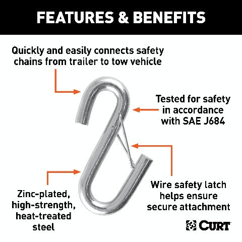 There are always some factors on the road you cannot control -- an irresponsible driver, adverse weather conditions -- but one thing you can control is the type of towing equipment you use. Just because there are threats out there, doesn't mean your towing adventures need to be dangerous. CURT offers a variety of towing safety products -- including safety chains, safety cables, hooks, links and more -- to make sure you have confidence to Bring It and trustworthy equipment to Bring It safely. CURT certified S-hooks are the easy, reliable way to connect your safety chains from your trailer to your tow vehicle. They feature a heat-treated steel construction to ensure long-lasting wear resistance, and they come with a zinc-plated finish to outlast the elements. This particular S-hook has a 13/32 diameter and offers a gross trailer weight capacity of 3,500 lbs. It also features a spring-loaded safety latch. Similar to a quick link, the safety latch allows for a safety chain connection that won't come loose from vehicle vibrations or jarring on uneven terrain. For added safety, this S-hook is tested in accordance with SAE J684. Remember, when attaching safety chains, the chains should be cross underneath the trailer coupler, and each hook and chain must be rated to meet or exceed the gross weight of the trailer.