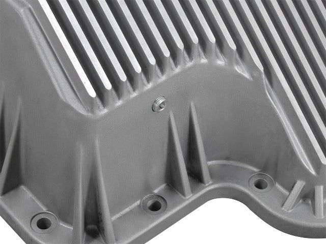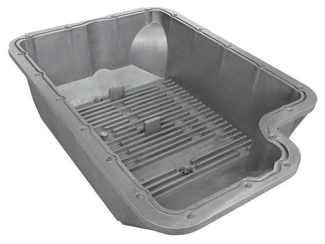 aFe POWER Street Series deep transmission pan brings performance engineering to the protection of your trucks transmission. This transmission pan has additional capacity for 7-1/2 more quarts over stock at the factory line, a magnetic drain plug and a 1/8" NPT port for your temperature sensor. Built-in internal and external fins transfer heat from the fluid to the outside air for maximum cooling. This transmission pan is constructed out of durable die-cast A380 aluminum with reinforced ribs and a raw finsh with machined accents for maximum strength and styling.