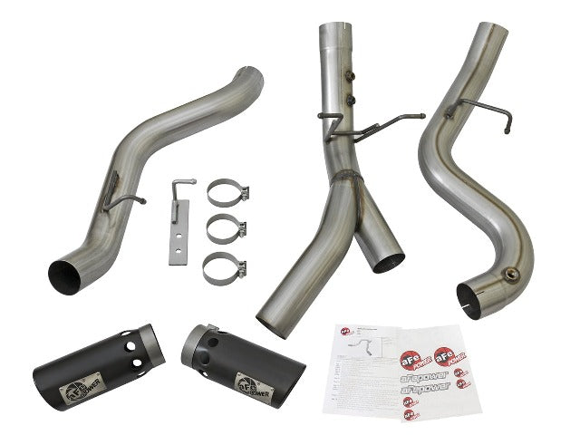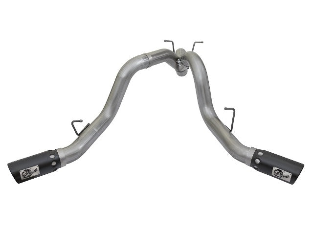Interested in a new exhaust system for your L5P Duramax? Check out the Large Bore-HD dual DPF-Back exhaust system by aFe. This system is constructed from 4" mandrel-bent 409 stainless steel tubing and uses high quality band clamps and OE-style bayonet hangers. This unit uses all factory mounting locations and comes with a bolt-on bracket that supports the driver side tailpipe. This provides for a quick, hassle-free installation with no modification necessary. Also included in this exhaust system are dual massive 6" high temp black powder-coated stainless steel tips with a laser-cut stainless steel aFe power badges. Large Bore-HD exhaust systems are the perfect combination of performance, fit and value. Single To Dual Exhaust Conversion: This exhaust is designed to convert the standard single exhaust into an aggressive dual exhaust. Fits With Spare Tire: This exhaust system fits perfectly without relocating the spare tire. OE Fit: OE-style bayonet hangers are used to maintain a stable pipe location during high vibration and high heat conditions. The bayonet tip holds the hanger bushing in place for an OE-style fit that does not change with time. Flow and Performance: This Large Bore-HD exhaust system is constructed from 4" mandrel-bent stainless steel tubing for maximum flow. Smooth transition bends allow for low turbulence, increasing horsepower, torque and lowering EGT's. Massive 6" Black Tips: Finishing off the exhaust are dual powder-coated high temp black 304 stainless steel exhaust tips. This tip features a laser-cut stainless steel aFe power badge for an aggressive style.