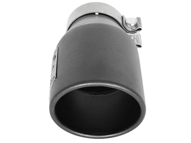 Finish off your custom or stock exhaust system with the Mach Force Xp 409 stainless steel, universal tip designed to fit most 3" exhaust systems. This 9" long, double-walled, slash cut exhaust tip is finished with a high-temperature, metallic black powder coating for corrosion resistance and a custom look. A unique laser-cut aFe Power logo plate is riveted on for brand quality authenticity and has a drain port built in for convenience. Completely adjustable, the tip includes a high quality stainless steel band clamp so there's no modification or welding required. Stainless Steel Construction This tip is constructed using 409 stainless steel for maximum strength and durability. High Temp. Metallic Black Coating A high-temperature metallic black powder coating has been applied to the tip for corrosion resistance and custom look. Drain Port A drain port on the bottom of the tip expends loose particles and condensation. aFe Badging This tip features an aFe POWER laser-cut logo plate that is riveted on for brand qualit y authenticity Leak-Free Seal A high quality stainless steel band clamp is used for a complete 360 degree sealing surface Universal Fit Universal tip - will fit to 3" stainless steel tubing. Tip comes slotted. See below for specifications. Tip Specifications 3" inlet x 4-1/2" outlet x 9" length, slotted