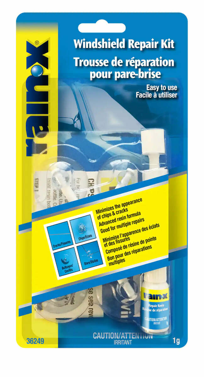 tyle:Pack of 1 Rain-X Windshield Repair Kit helps you minimize the appearanceand stop the spread of chips and cracks in your windshield. It removes airfrom the break, fills it with durable resin and makes it even stronger thanbefore. For best results, repairs should be made as soon as possible after thedamage occurs and before the break is contaminated by dirt or water. The kitworks best on round damage not more than one inch in diameter, and cracks notlonger than 12 inches. It will not repair damage to more than one layer ofglass.