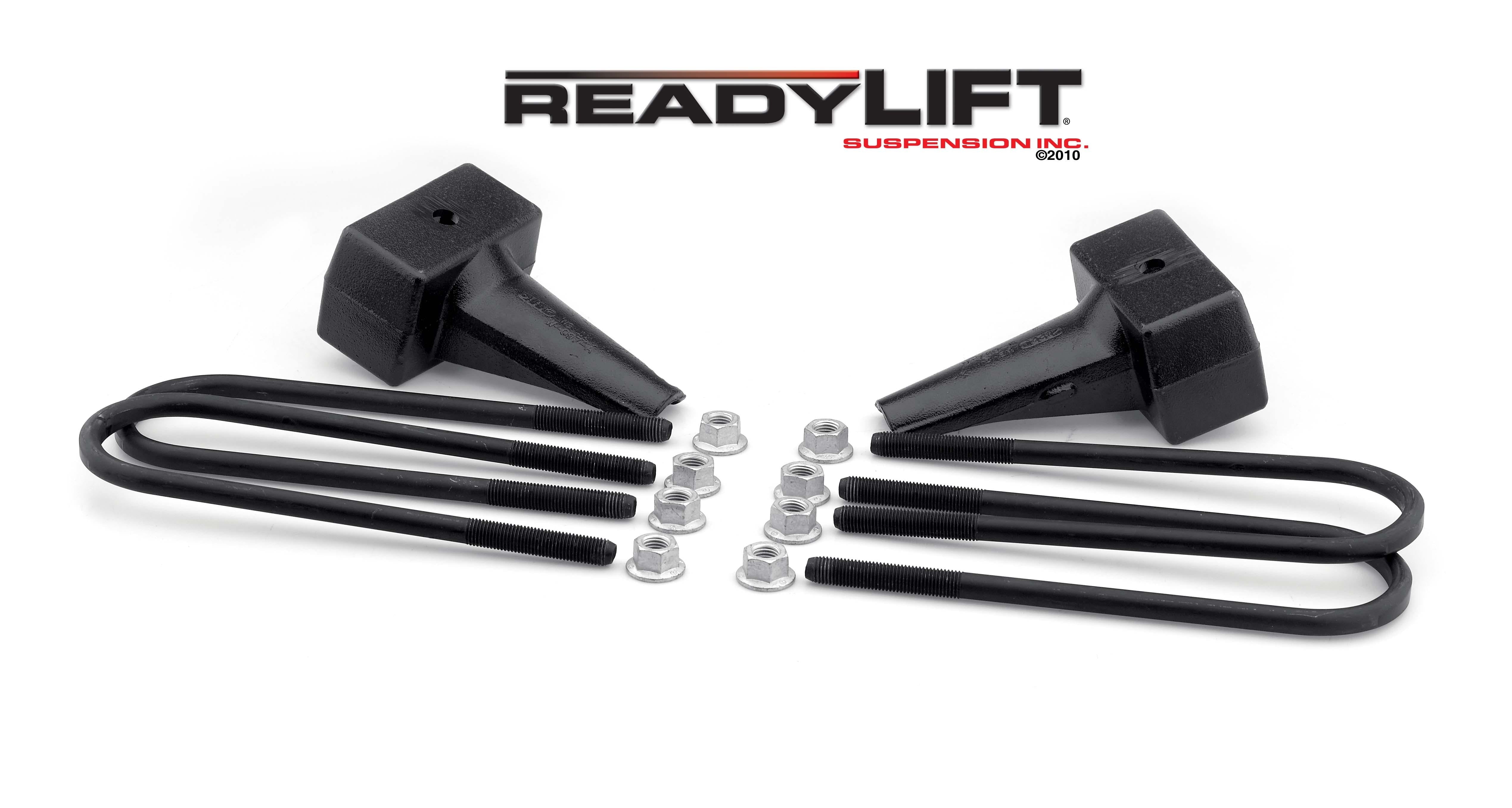 ReadyLift OEM style rear block kits are now available for model specific applications. The Rear Block Kits will safely lift the rear of your truck and additional 1 in. -3 in. Based on OEM designs and never made out of light weight extrusions, our 1 in. Toyota and GM blocks are made of cast iron and our 3 in. GM blocks have Anti-Rotation ears built in. The Ford Super Duty 4 in. blocks have Integrated OEM style bump stops. These kits will put the rake back into your truck for hauling or towing and are designed to work in concert with your ReadyLift Suspension Leveling Kit. Comes with a Limited Lifetime warranty.