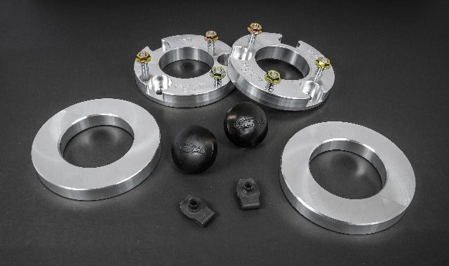 Level your truck with style, fit and function for larger tires and wheels. ReadyLIFT T6 Billet Suspension leveling kits are made in the USA using only premium 6061 T6 aircraft billet aluminum and includes 10.9 rated mounting hardware and associated kit parts to get the leveling lift job done right with super cool looks! ReadyLIFT leveling kits are direct bolt-on applications maintaining the factory ride and factory alignment specifications. No cutting or drilling is required when installing our new T6 Billet kits. The ReadyLIFT line of stylish leveling kits are now available in a tough anodized black, silver, blue and red finish and are laser etched with our ReadyLIFT(R) Suspension logo. The T6 Billet line is the ultimate in looks and leveling functionality! Our development team precisely engineers proprietary features into all ReadyLIFT leveling kits to insure the right leveling kit and advertised lift amount for each application. T6 Billet offers truck and SUV owners the option to leveling their vehicles with a custom appearance.