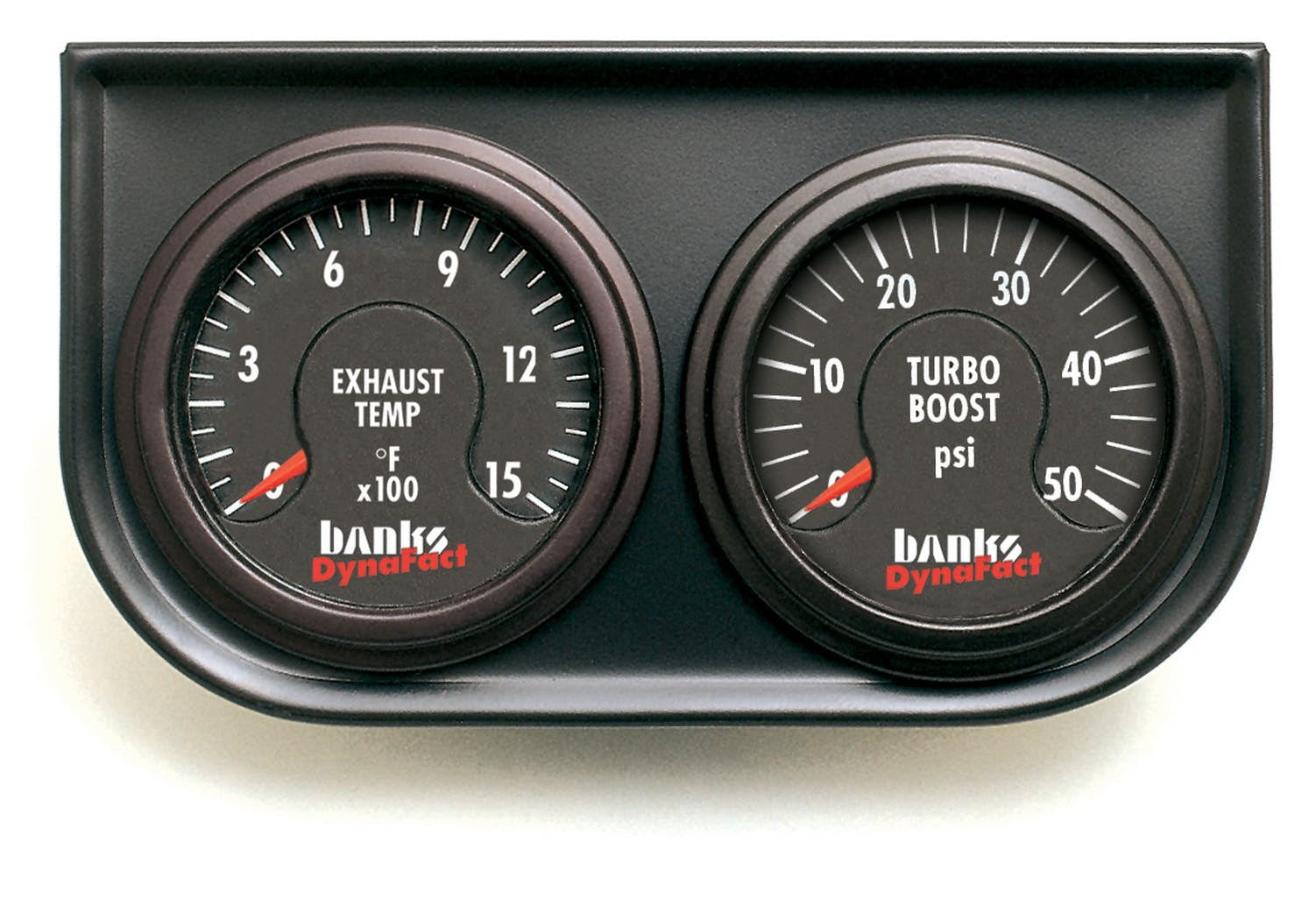 Banks exclusive DynaFact electronic gauges offer precision that cant be matched by mechanical gauges. The pyrometer provides exhaust-gas temperature (EGT) measurements that are accurate within +/-15 Degree Fahrenheit at maximum operating temperatures. The pyros spring-loaded, jeweled movement is resistant to vibration and sports a lit, easy-to-read 0-1500 Degree Fahrenheit face. Banks 0-50 psi boost gauge monitors power and turbo performance. Includes 2-gauge mounting panel. Top-mount and/or pillar-mount options available. DynaFact Electronic Gauge Assembly with Thermocouple for use with 2001-2007 Chevy, 2003-2007 Dodge, 2003-2007 Ford