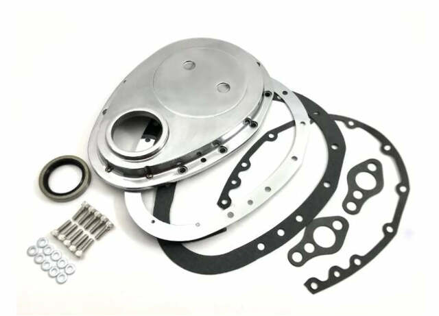 2-pc polished aluminum Small Block Chevy v8 timing chain cover