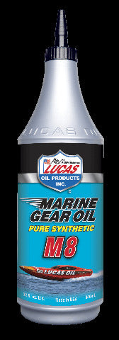 Lucas M8 Synthetic SAE 75W-90 Marine Gear Oil is a pure-synthetic, non-foaming, super slick, long lasting lubricant designed especially for marine applications. Contains a special additive package that cushions gears and resists ?squeezing out? under extreme pressure situations where other gear lubricants just don?t hold up. We have improved the high speed shock load and significantly improved anti-wear performance which provides the ultimate protection to the gear components. Specially designed to stand up to high temperatures without losing its lubricity. Excellent for use in stern drives, v-drives, gear boxes, wheel bearings and superchargers.