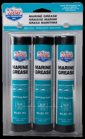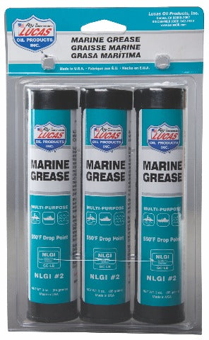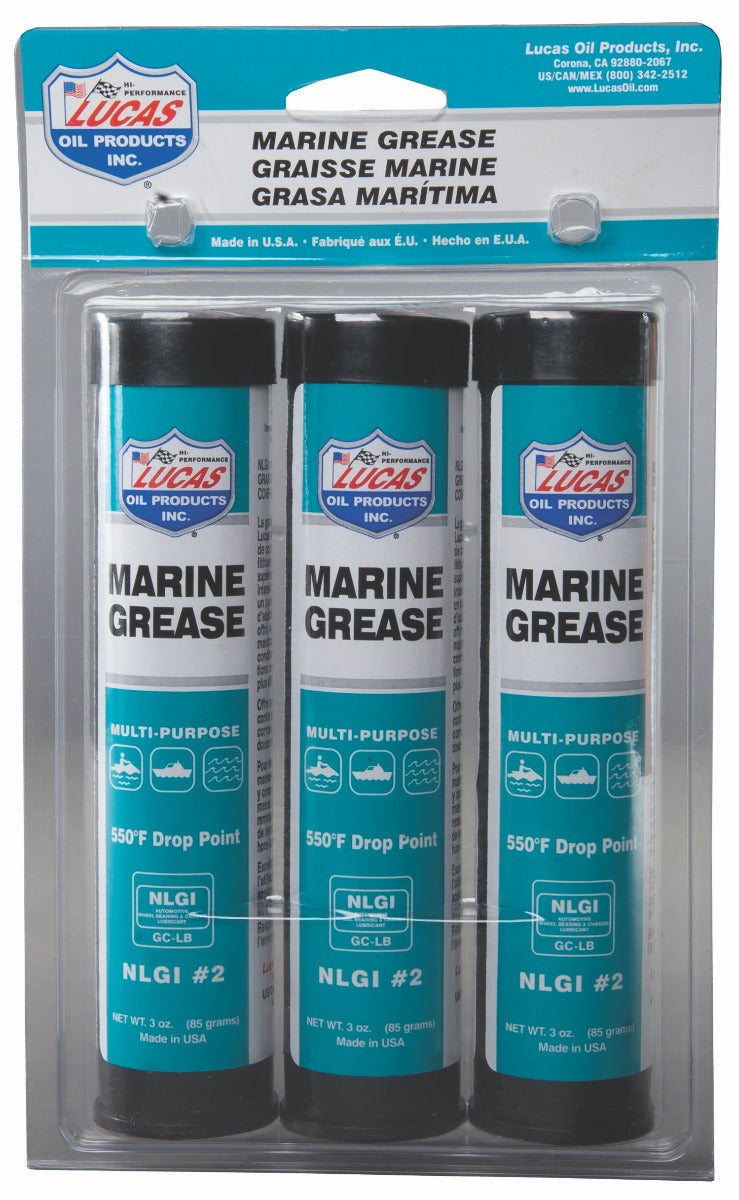 Convenient 3 pack of Lucas' popular Marine Grease. Lucas Marine Grease is a premium, extreme pressure, multi-purpose, heavy duty lithium complex grease containing unique polymers, anti-wear agents, tackifiers and rust and oxidation inhibitors to provide the highest performance properties. It has been designed to lubricate under the most severe operating conditions in marine applications, and because of its adhesive properties it effectively stays in place. Lucas Marine Grease provides excellent fresh water and salt water corrosion protection. Its fortified formula provides excellent extreme pressure properties with a Timken OK load of 80 pounds, effective water resistance and shock loading protection as indicated by the typical weld point of 620 kg. The minimum industry standard is 200 kg. Lucas Marine Grease is a truly universal marine grease with applications in trailer wheel bearing, trailer chassis lubrication and outboards. It also has crossover applications in automotive wheel bearing and chassis lubrication. NOT RECOMMENDED FOR CENTRALIZED DISPENSING SYSTEMS.